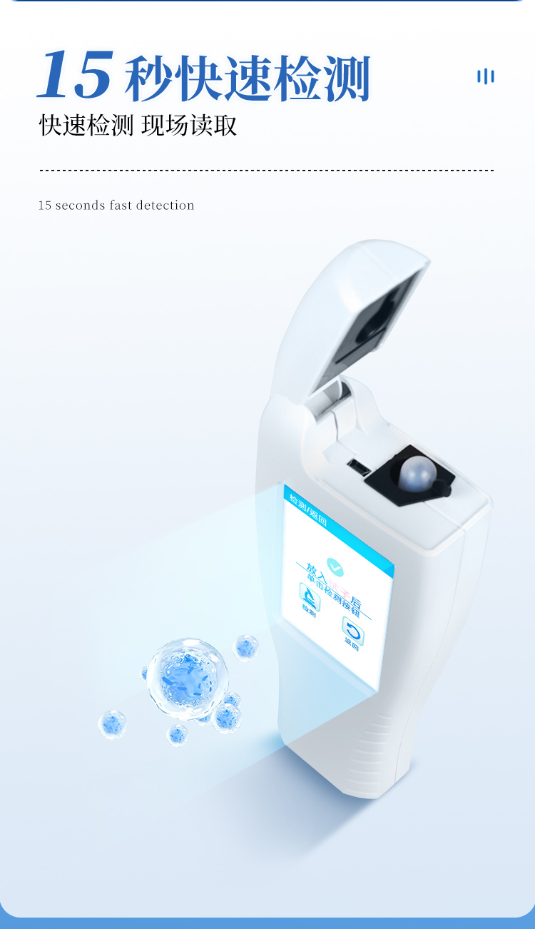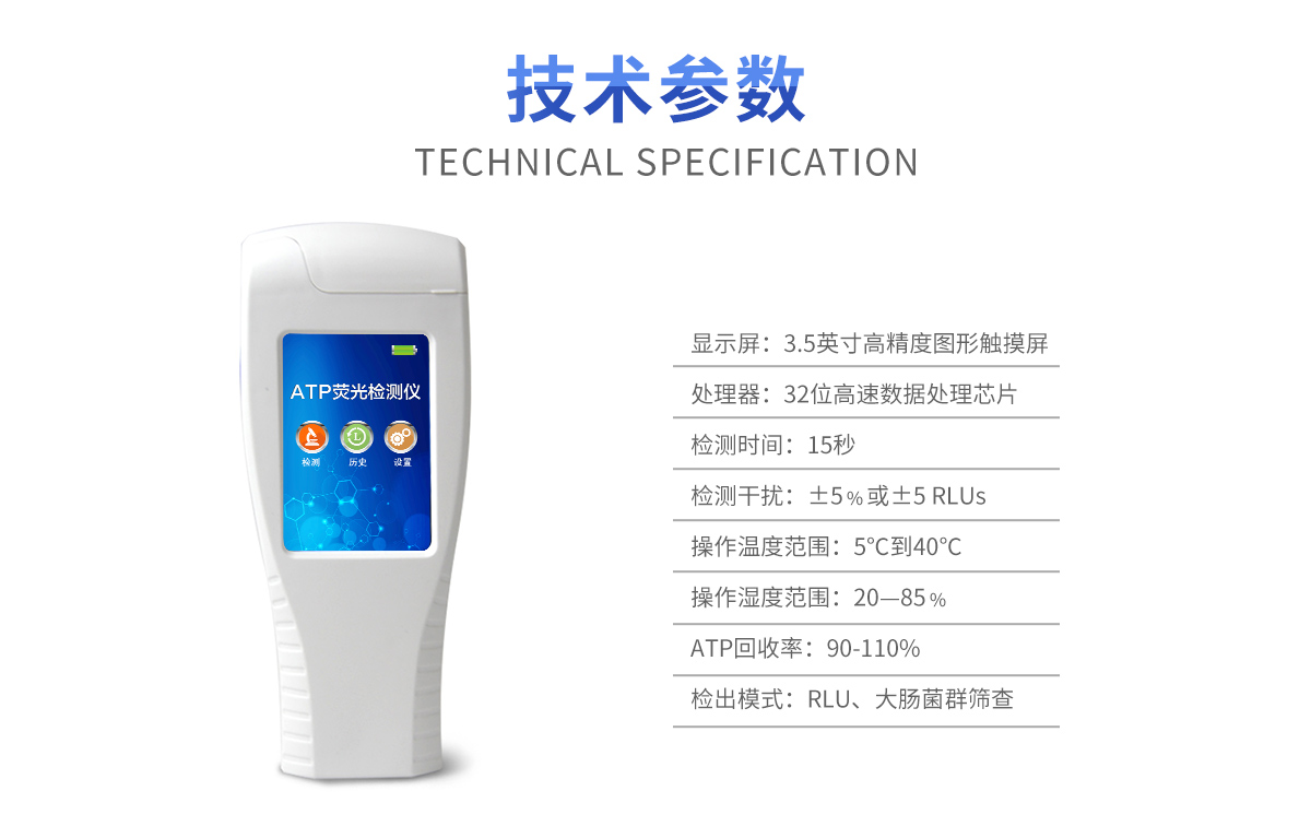 该设备采用生物化学反应方法检测ATP含量,ATP荧光检测仪基于萤火虫发光原理,利用“荧光素酶—荧光素体系”快速检测三磷酸腺苷(ATP)。ATP拭子含有可以裂解细胞膜的试剂,能将细胞内ATP释放出来,与试剂中含有的特异性酶发生反应,产生光,再用荧光照度计检测发光值,微生物的数量与发光值成正比,由于所有生物活细胞中含有恒量的ATP,所以ATP含量可以清晰地表明样品中微生物与其他生物残余的多少,用于判断卫生状况。