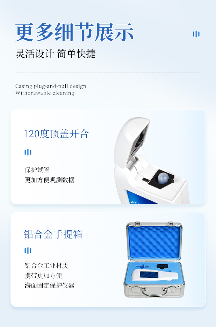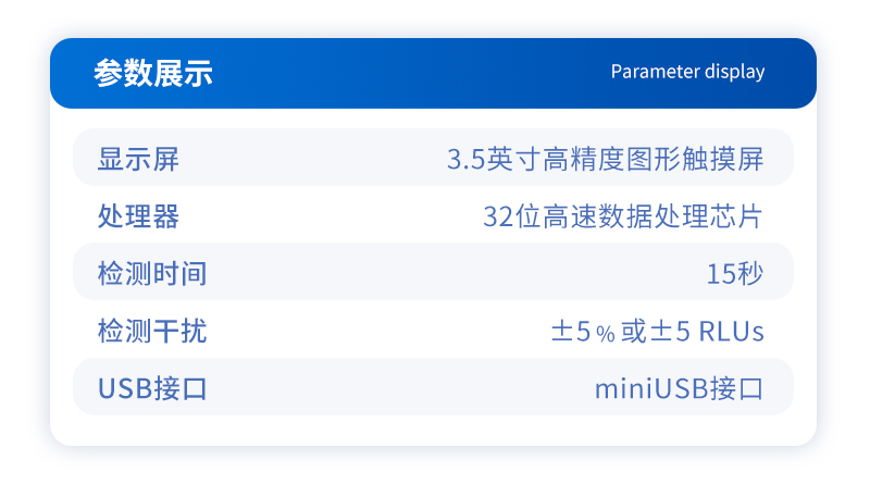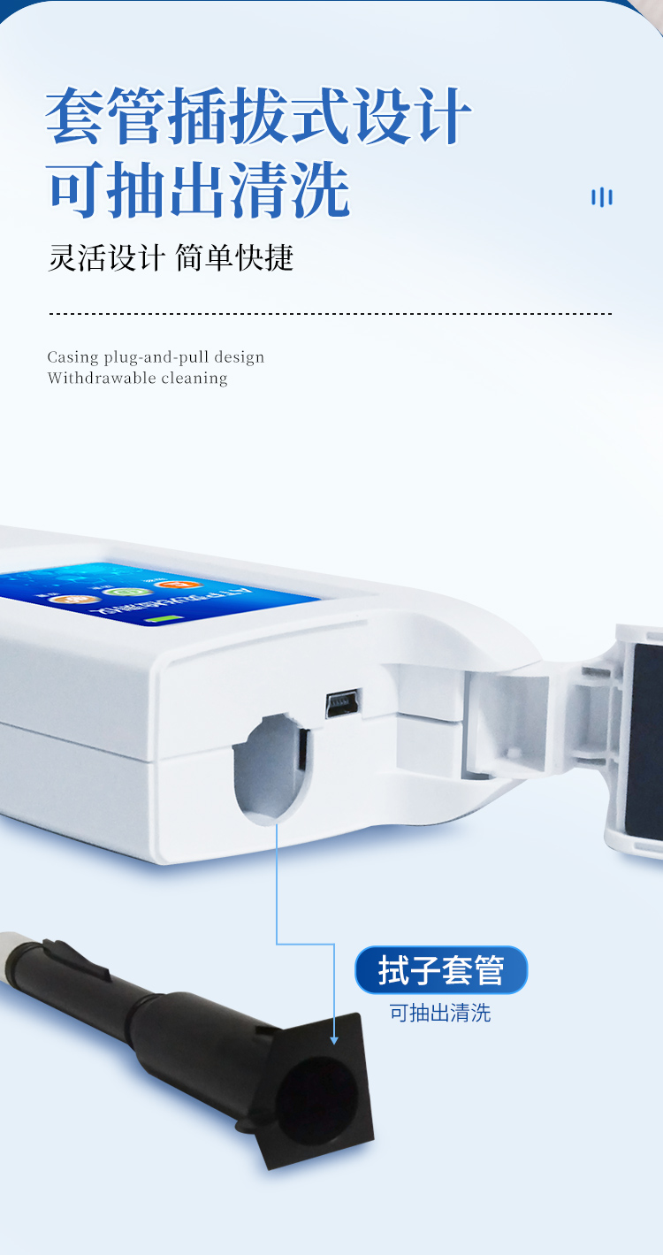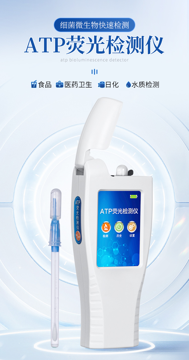 该设备采用生物化学反应方法检测ATP含量,洁净度检测仪基于萤火虫发光原理,利用“荧光素酶—荧光素体系”快速检测三磷酸腺苷(ATP)。ATP拭子含有可以裂解细胞膜的试剂,能将细胞内ATP释放出来,与试剂中含有的特异性酶发生反应,产生光,再用荧光照度计检测发光值,微生物的数量与发光值成正比,由于所有生物活细胞中含有恒量的ATP,所以ATP含量可以清晰地表明样品中微生物与其他生物残余的多少,用于判断卫生状况。