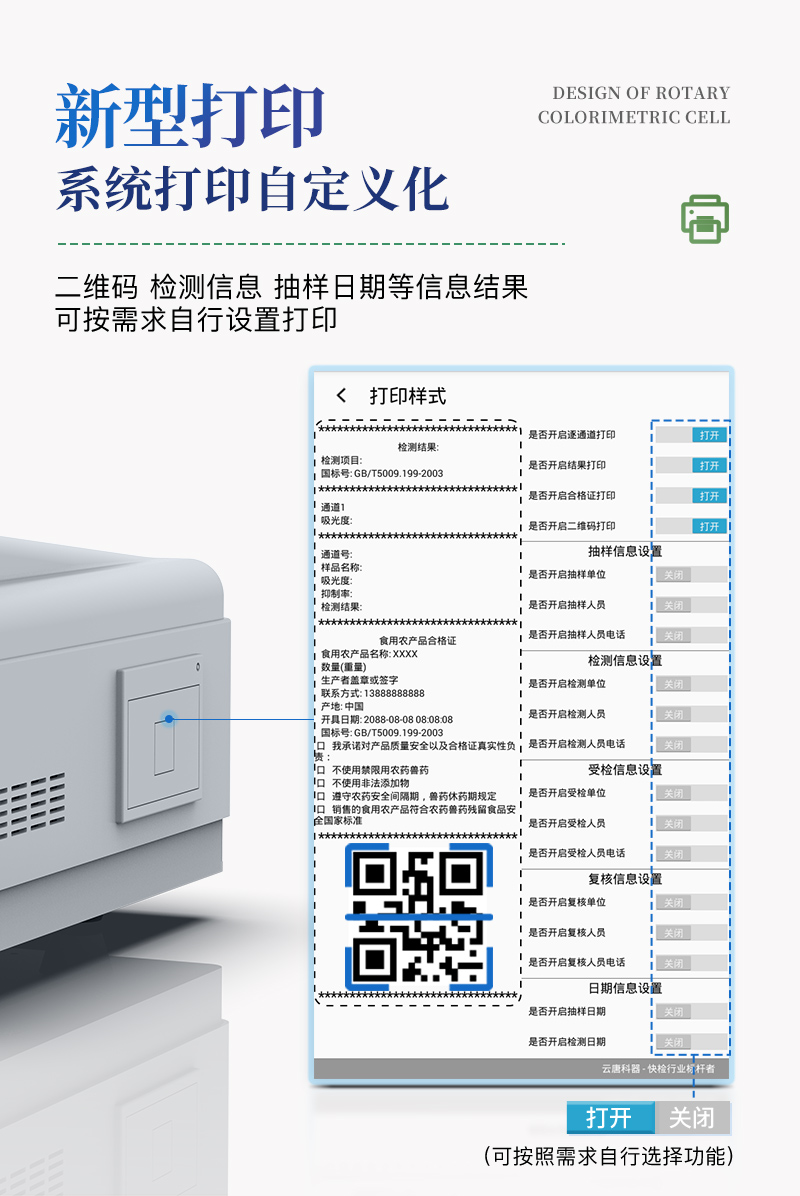 5、配备新一代嵌入式热敏打印机,可选择手动打印或者自动打印,检测完成可自动打印检测报告和二维码。