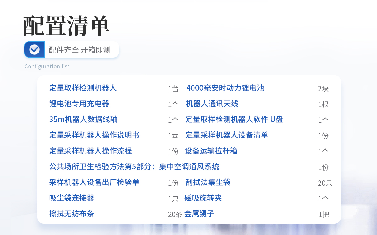 定量取样检测机器人:1台 4000毫安时动力锂电池:2块 锂电池专用充电器:1个 机器人通讯天线:1根 35m机器人数据线轴:1个 定量取样检测机器人软件 U盘:1个 定量采样机器人操作说明书:1本 定量采样机器人设备清单:1份 定量采样机器人操作流程:1份 公共场所卫生检验方法第5部分:集中空调通风系统:1份 采样机器人设备出厂检验单:1份 刮拭法集尘袋 :20只 吸尘袋连接器 :1只 磁吸旋转夹:1个 擦拭无纺布条 :20条 金属镊子:1把 设备运输拉杆箱:1个