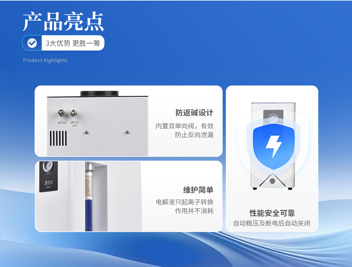 1、可取代高压氮气瓶,使实验室仪器化。 2、操作简便,只需启动电源开关,仪器即可产氮且输出压力稳定。 3、不消耗电解液;电解液只起离子转换作用并不消耗,所以只需补充因蒸发而损失的少量蒸馏水。 4、产气纯度高,空气经电解池分离后即可得到高纯氮气。 5、性能安全可靠:具有稳压和断电后自动关闭气路功能。 6、寿命长,既可间断使用,又可连续使用且产气量稳定、不衰减。 7、**节能:采用**的开关电源,提高了电解效率。 8、配有双单向阀,自动防返碱。