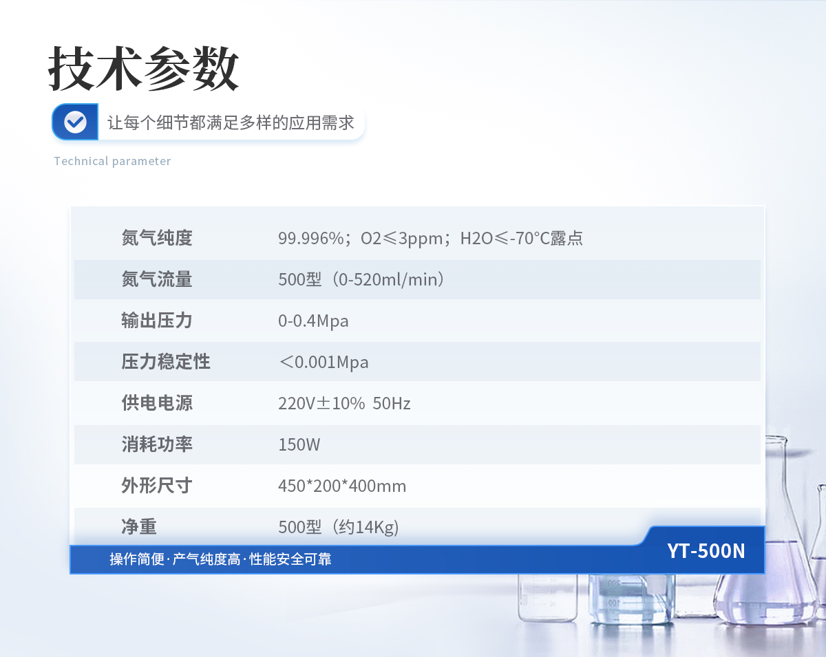 1、氮气纯度: 99.996%;O2≤3ppm;H2O≤-70℃露点 2、氮气流量: 0-320ml/min 3、输出压力: 0-0.4Mpa 4、压力稳定性:<0.001Mpa 5、供电电源: 220V±10% 50Hz 6、消耗功率: 120W 7、外形尺寸: 450*200*400mm 8、净重: 300型(约14Kg)
