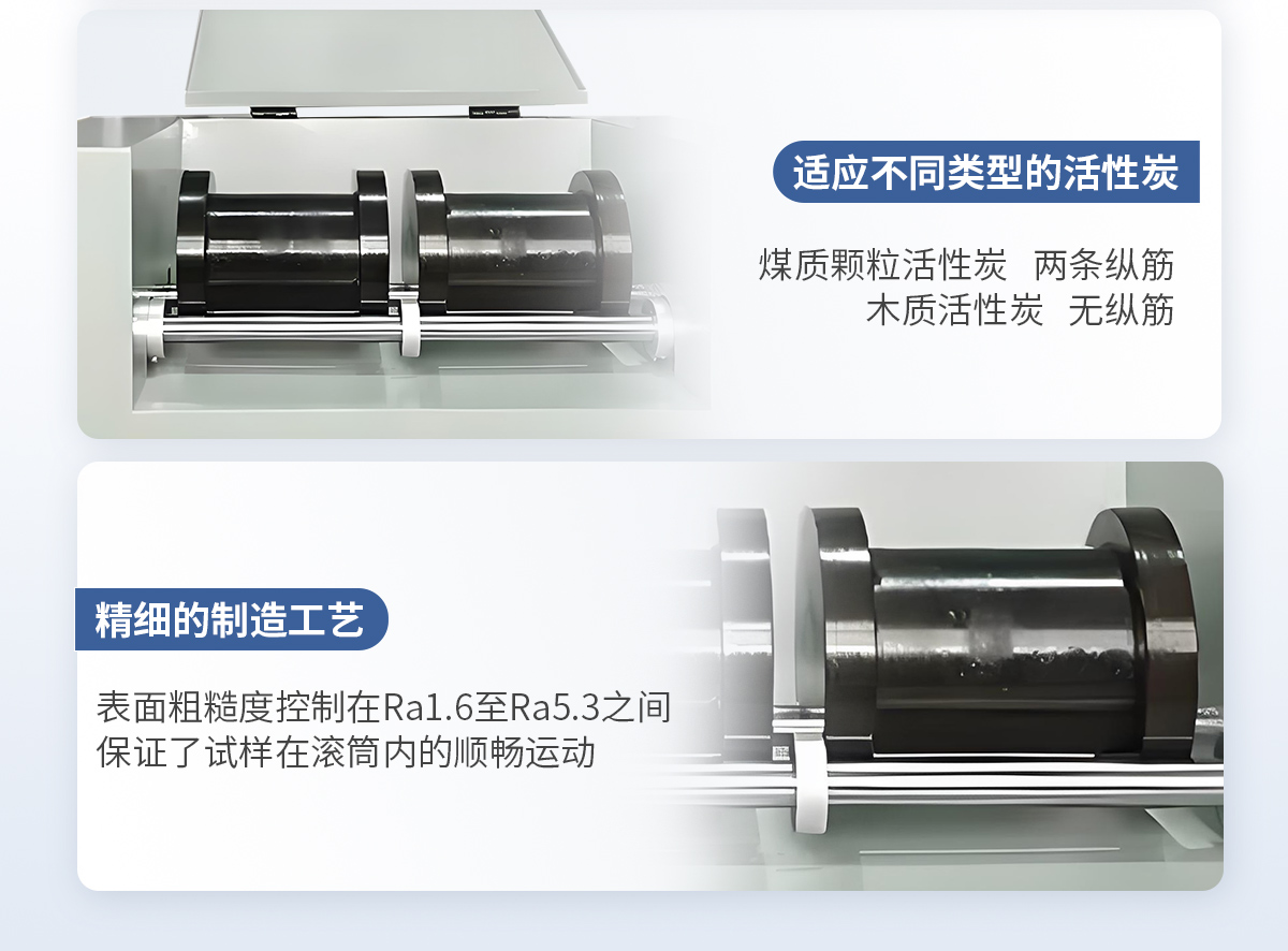 活性炭强度测定仪仪按照规定的试验条件,将活性炭试料置于装有钢球的滚筒中,开启强度测定仪,开始计时,通过滚筒的机械运动,试料被磨损,测定被破坏试料粒度的变化情况,用保留在试验筛上的试料质量占原试料的质量分数,可求出活性炭试样的强度。