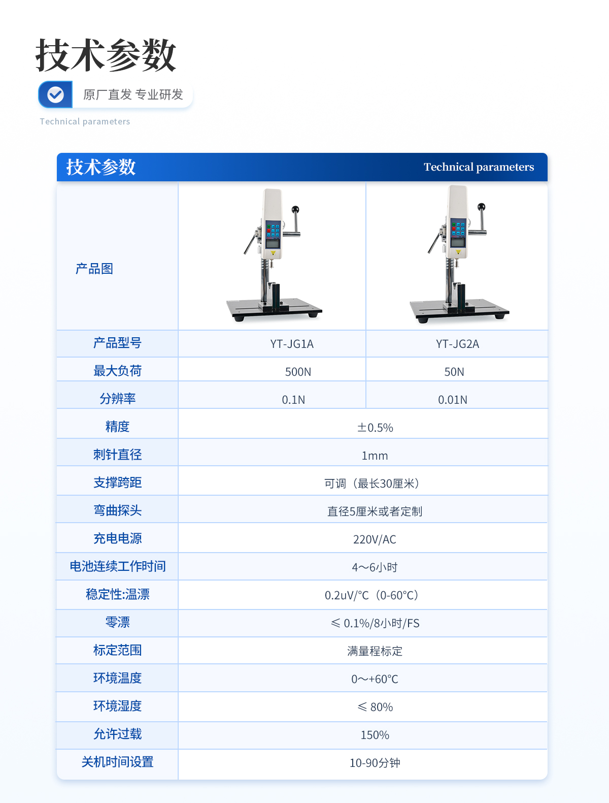 | **负荷:500N (其他量程可定制,N、Kg和ib三种单位可自动转换) | 分辨率:0.1N | 精度:±0.5%; | 刺针直径:1mm | 支撑跨距:可调(*长30厘米) | 弯曲探头:直径5厘米或者定制 | 充电电源:220V/AC; | 电池连续工作时间:4~6小时; | 稳定性:温漂:0.2uV/℃(0-60℃); | 零漂:≤ 0.1%/8小时/FS; | 标定范围:满量程标定; | 环境温度:0~+60℃; | 环境湿度:≤ 80%; | 允许过载:150%; | 关机时间设置:10-90分钟。 |