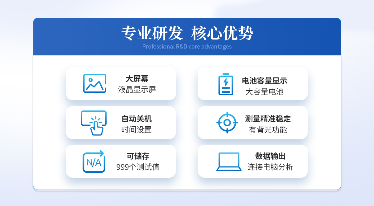 | 1、三种不同测头:可进行茎杆弯折性能测量、茎秆抗压强度测量、茎杆组织结构(穿刺)强度测量;弯折支架距离可调,并标有刻度。 | 2、可配测位移标尺 | 3、可连接电脑测试,可保存、打印,做各种分析,输入速度、面积还可显示位移、压强等参数; | 4、可储存999个测试值; | 5、大屏幕液晶显示,有背光功能,并具有屏幕数字正、倒反转功能; | 6、自动关机时间设置; | 7、电池容量显示,电量过低自动关机。 |