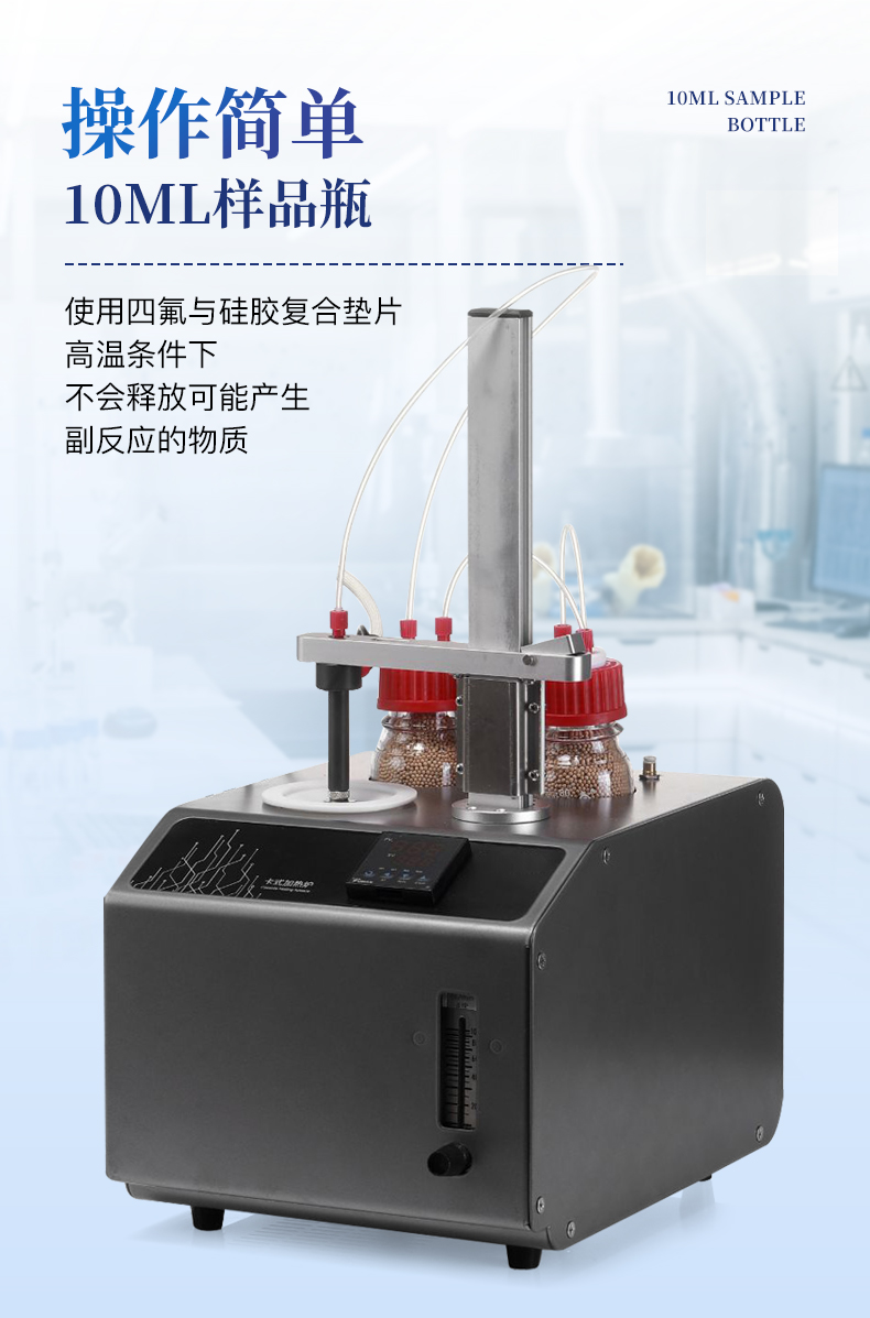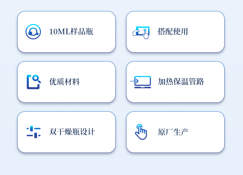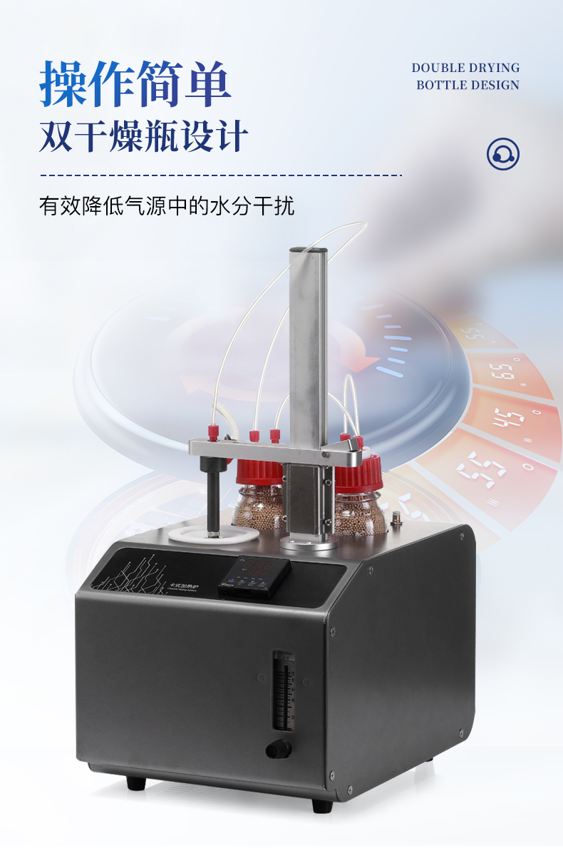 | 1、10ml样品瓶:使用四氟与硅胶复合垫片,高温条件下不会释放可能产生副反应的物质 | 2、双干燥瓶设计,有效降低气源中的水分干扰 | 3、加热保温管路,防止水汽在输送过程中冷凝,提高测试准确性 |