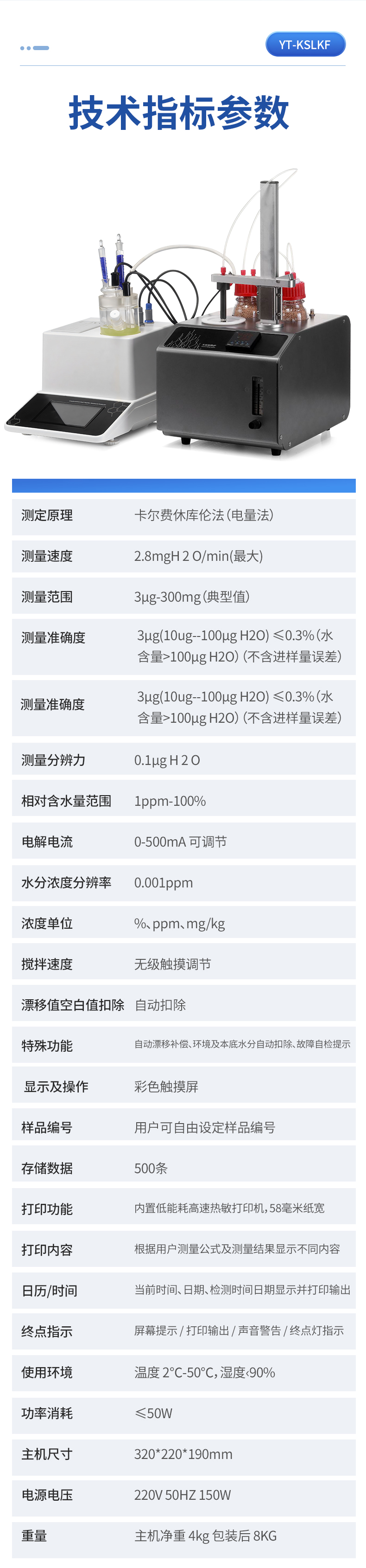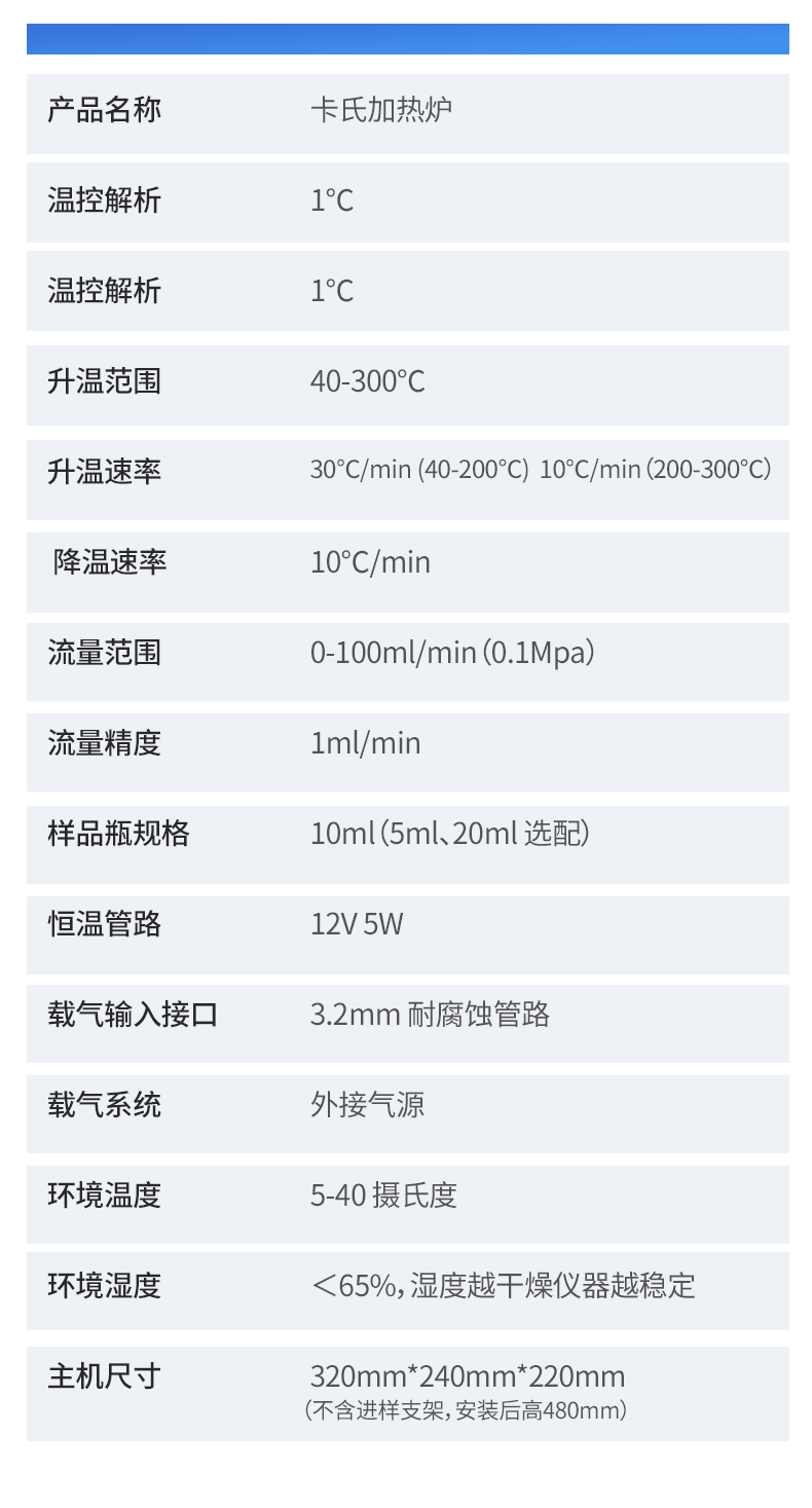 | 1. 采用高精度库仑法水分测定仪与卡氏加热炉联用,**可以检测到3μg水,精度达到ppm级; | 2. 空芯气针进样,和带加热功能的气体输送管路,零死体积水汽不凝结,操作更简单,同时也很大的提高了仪器的准确性和重复性; | 3. 5.7寸高清电容触摸屏,实时显示测量参数,简洁明了的功能菜单,全面的参数显示,操作方便快捷 ; | 4. 内置5种方法可供选择,8种计算公式方便各种样品检测,自定义样品单位%、ppm、mg/kg等结果单位更加人性化; | 5. 系统实时检测环境中的水分,精准扣除漂移,采用实时动态阻抗法判定滴定终点,测量结果更精准; | 6. **温度300℃可以满足大部分样品检测,气流0-100ml可调,适合各种水分释放速度的样品; | 7. 操作方便,用户只需要设置合适的温度,合适的流量,把样品放入事先准备好的样品瓶,放入加热器,然后把传输针扎入样品瓶的硅胶垫,在仪器上点开始测量即可; | 8. 无需等待上一次样品瓶冷却之后才能进行下一次样品测量,更换样品瓶过程中样品瓶始终保持密封状态,测量效率更高更准确,尤其是吸湿性强的样品无需担心空气中水分的干扰; | 9. 采用顶空进样的方式,保证每个测定采用“新”的样品瓶,样品测定无交叉感染。样品瓶体积小,确保较小的死体积和背景水分值。独立密闭样品瓶,测定时无需样品转移,结果更准确; | 10. 旋盖式样品瓶,无需专用且昂贵的压盖器和开盖器,使用非常方便; | 11. 顶空进样技术,只有气体进入水分测定仪反应杯,不污染反应杯及电解电极。 |