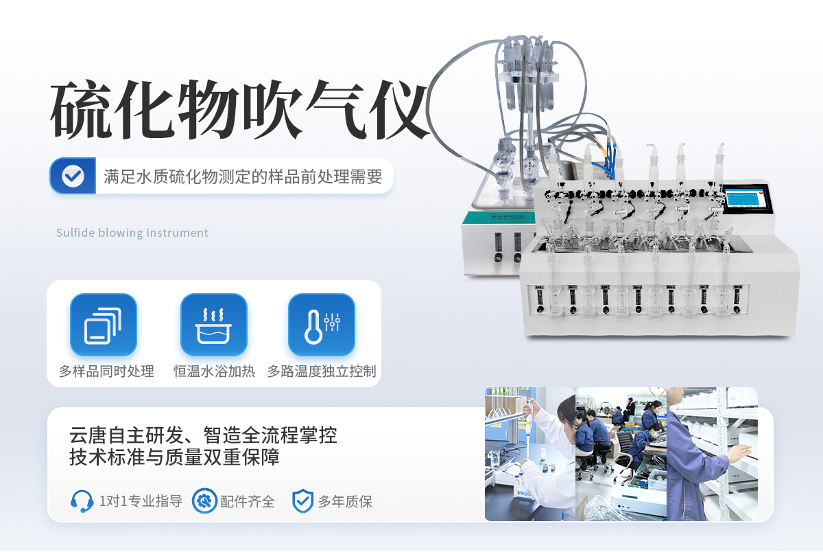 水质硫化物酸化吹气仪根据水质硫化物的测定-亚甲基蓝分光光度法(碘量法)标准开发生产的。满足水质硫化物测定的样品前处理需要。
