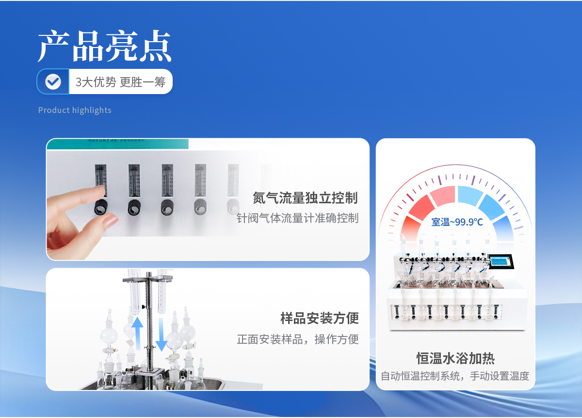 1、大容量反应瓶,可同时处理多个样品。 2、盐酸口、气体进口、出口三口一体且相互独立,操作会不干扰。 3、恒温水浴加热,具有快速自动恒温控制系统,加热温度可以手动设定。 4、由升降位置固定旋钮调节样品架及配气系统的升降旋转样品架,正面安装样品,操作方便。 5、每个样品的氮气流量独立控制调节或关闭,针阀气体流量计准确控制和显示气体总消耗量。