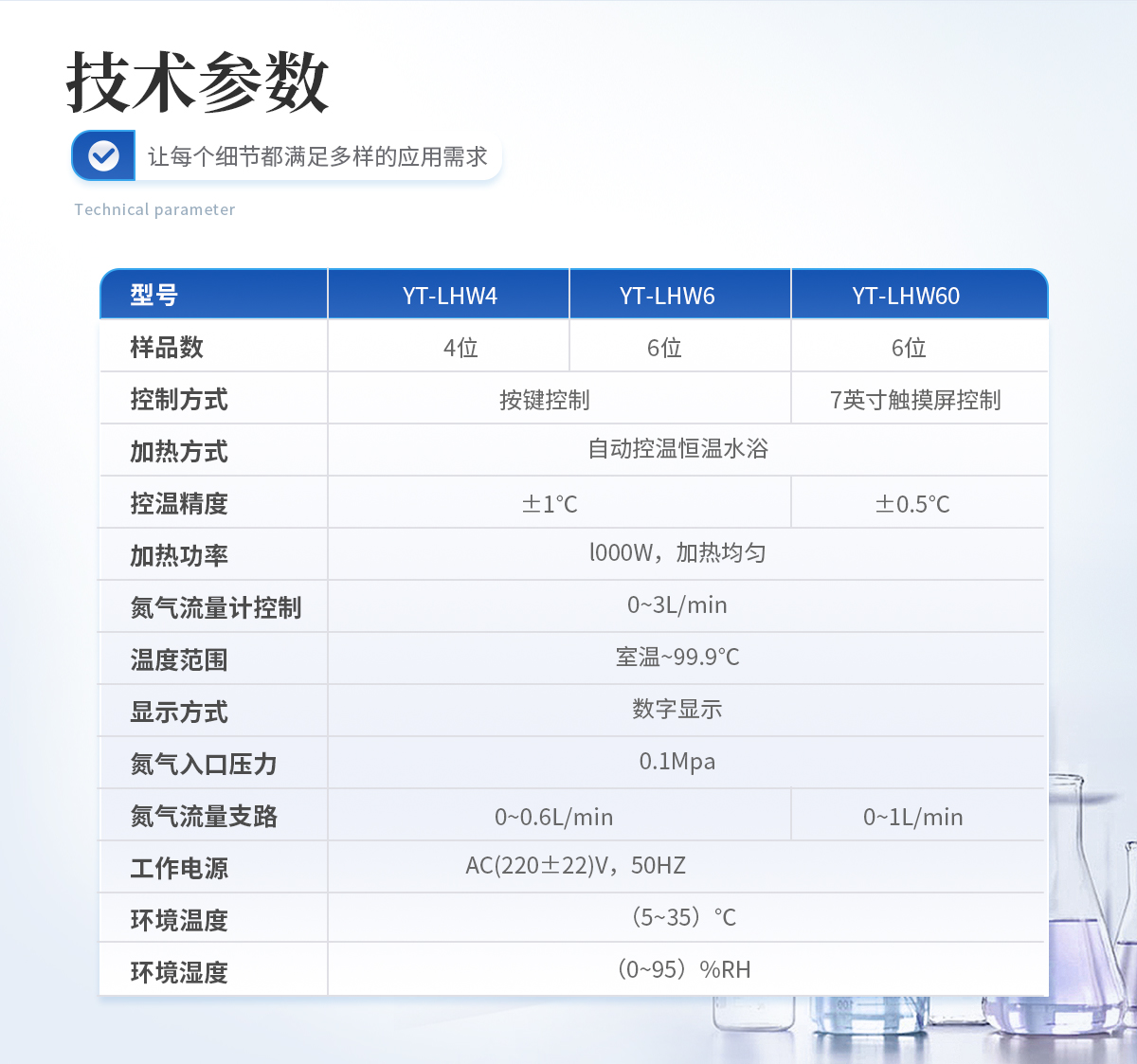 1.样品数: 6位 2.加热方式:自动控温恒温水浴 3.加热功率:l000W,加热均匀 4.氮气流量计控制:0-3L/min 5.温度范围:室温-99.9℃ 6.显示方式:数字显示 7.控温精度:±1℃ 8.氮气入口压力:0.1Mpa 9.氮气流量支路:0-0.6L/min 10.工作电源:AC(220±22)V,50HZ 11.环境温度:(5-35)℃ 12.环境湿度:(0-95)%RH