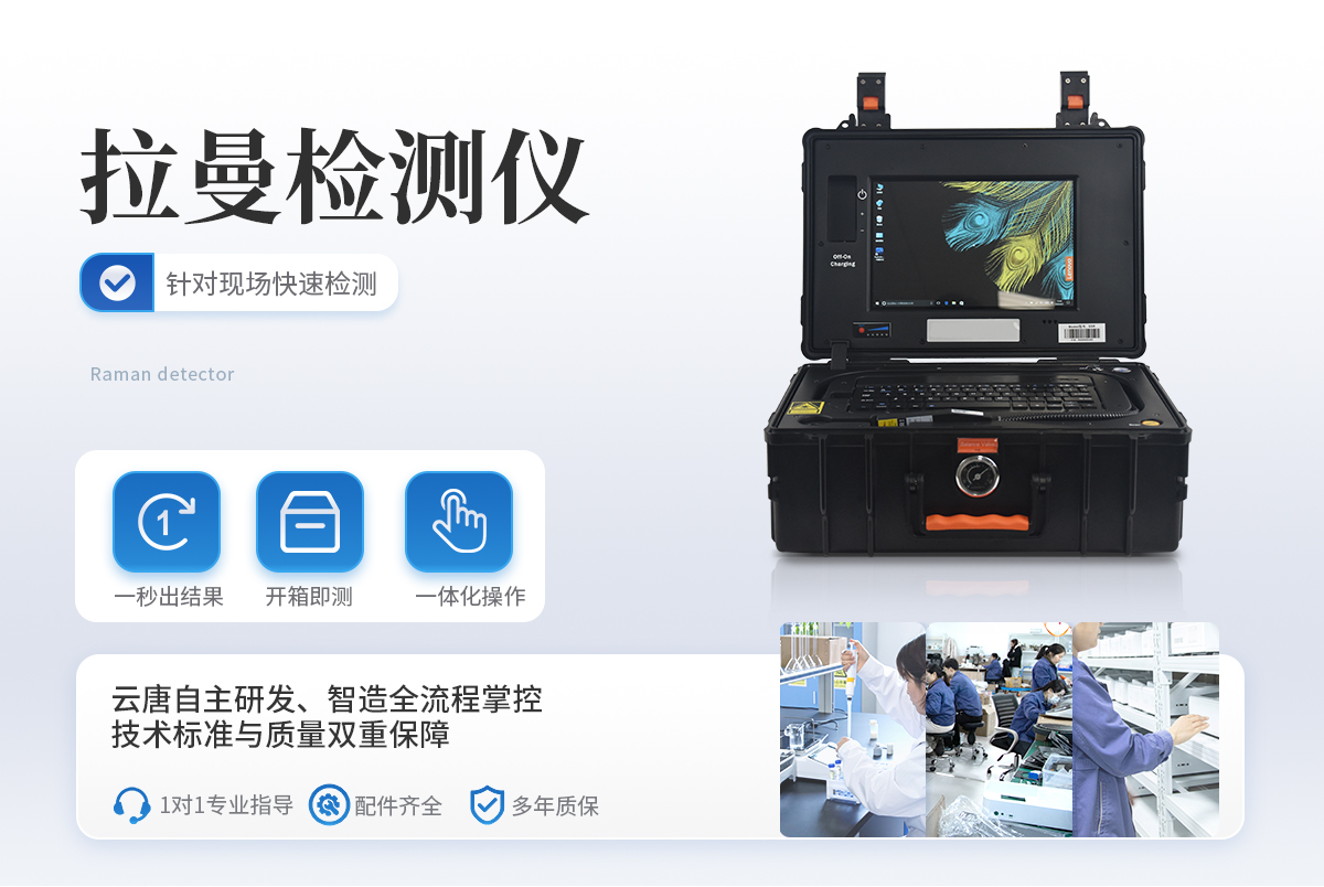 更专业 785nm光源:有效抑制荧光,适合便携式移动应用 超宽的光谱范围:检测物质种类更多 更高的信噪比:超强的微小信号探测能力 优质激光光源:数字可调高功率输出,窄线宽保障谱图质量 更便捷 光学聚焦设计:可以隔着塑料袋、玻璃瓶直接检测 快速自稳定光源:机器启动无预热时间,即开即用 超快检测速度:一秒出结果 便携式设计:独立可充电电源供电,随装随走,适合各种现场快检 更贴合应用 在线谱图库:提供各行业应用多维谱图库,支持在线升级 专业分析算法:智能解谱,自动匹配,多组分分析 行业应用软件:提供针对行业专用软件,支持客户订制