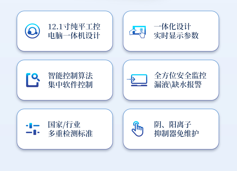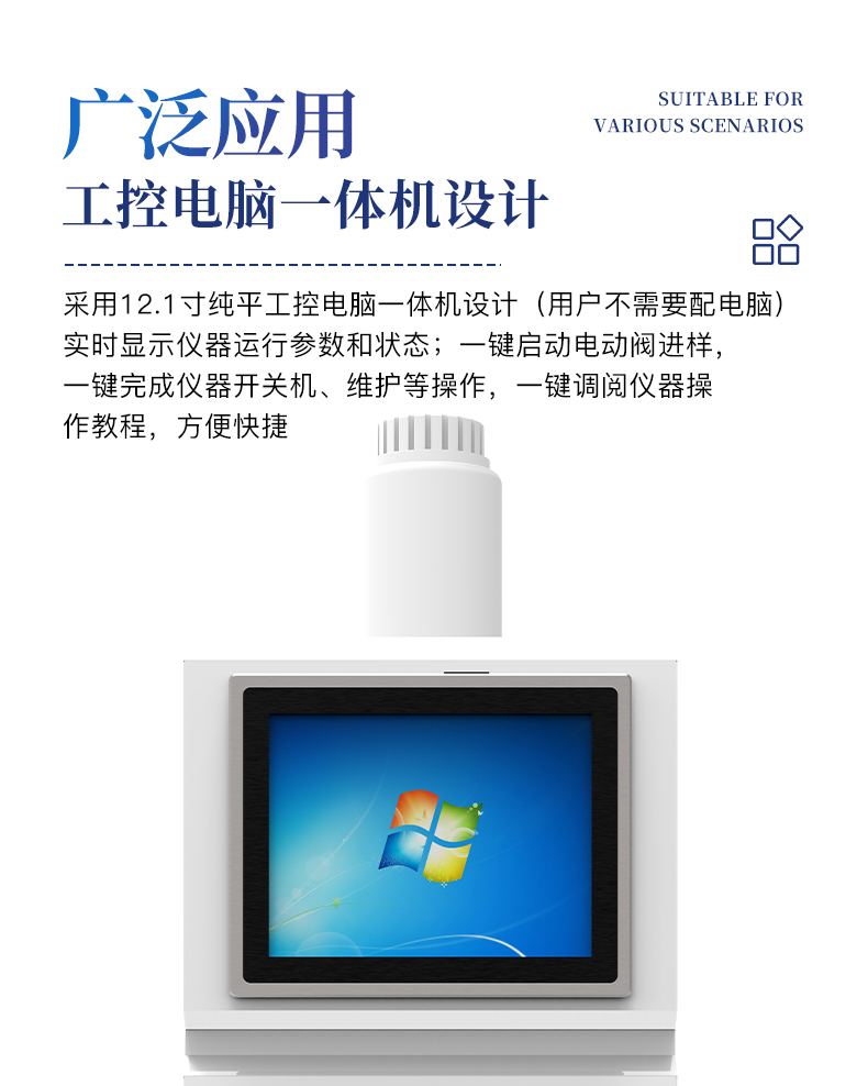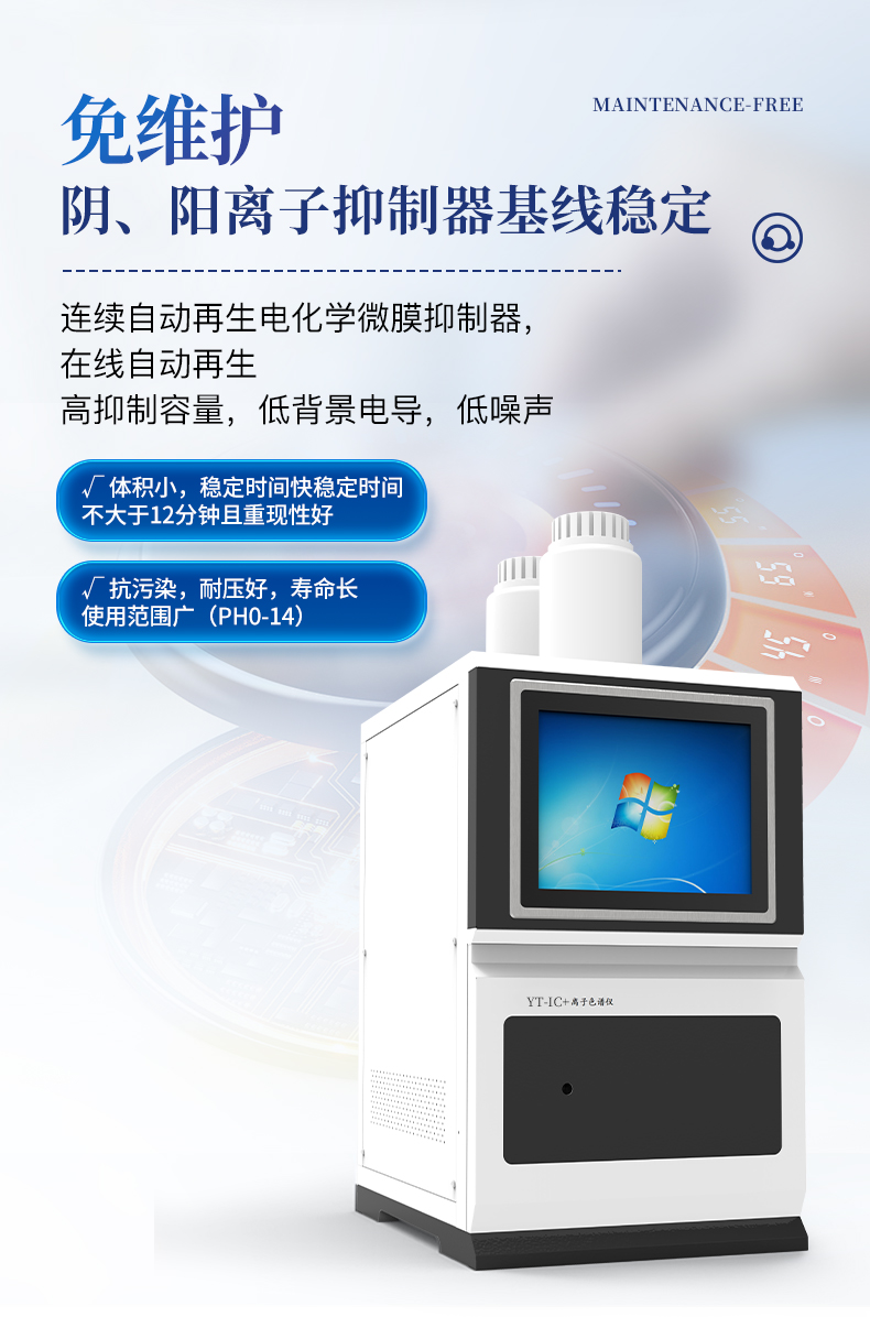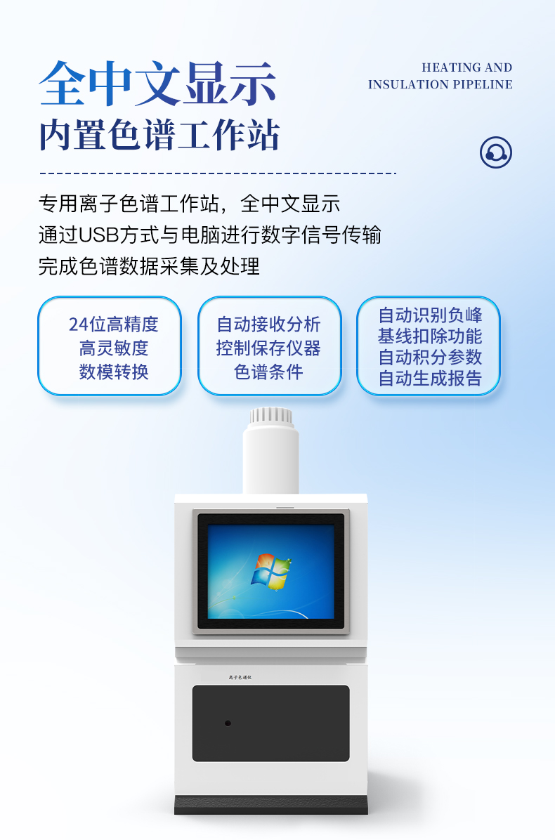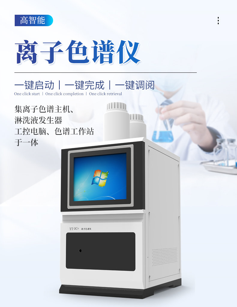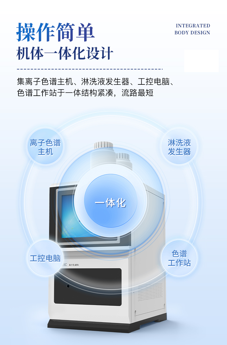 | 全新一代离子色谱仪,采用12.1吋纯平工控电脑一体机设计(用户不需要配电脑),实时显示仪器运行参数和状态;一键启动电动阀进样,一键完成仪器开关机、维护等操作,一键调阅仪器操作教程,方便快捷。 | 离子色谱仪核心零部件自主研发、自主知识产权可控。采用一体化设计,集离子色谱主机、淋洗液发生器、工控电脑、色谱工作站于一体,结构紧凑,流路*短,对流路造成的峰型扩展有很好的改善。一体化恒温箱:色谱柱、抑制器、电导池、放大电路都处于同一恒温系统,改善了电导检测器的温飘和基线噪声。内置多处漏液报警器和缺水报警器,全方位安全监控。由PLC控制的各个部件统一到电脑显示屏的集中软件控制系统,操作方便,鼠标所见即所控。 |