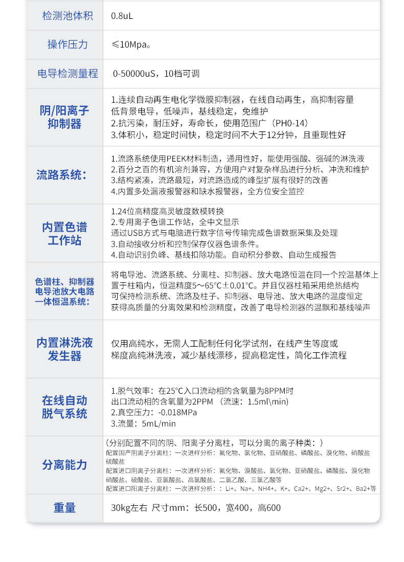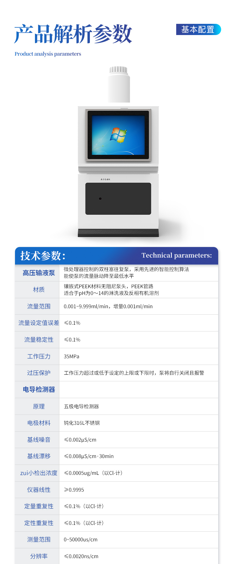 | 1 高压输液泵: 微处理器控制的双柱塞往复泵,采用**的智能控制算法,能使泵的流量脉动降至**水平。 1.1,材质:镶嵌式PEEK材料无阻尼泵头,PEEK管路,适合于pH为0~14的淋洗液及反相有机溶剂。 1.2,流量范围:0.001~9.999ml/min,增量0.001ml/min。 1.3,流量设定值误差:≤0.1% 1.4,流量稳定性:≤0.1% 1.5,工作压力:35MPa 1.6,过压保护:工作压力超过或低于设定的上限或下限时,泵将自行关闭且报警。 | 2 电导检测器: 2.1,原理:五极电导检测器 2.2,电极材料:钝化316L不锈钢 2.3,基线噪音:≤0.002μS/cm 2.4,基线漂移:≤0.008μS/cm·30min 2.5,zui小检出浓度:≤0.0005ug/mL(以Cl-计) 2.6,仪器线性:≥0.9995 2.7,定量重复性:≤0.1%(以Cl-计) 2.8,定性重复性:≤0.1%(以Cl-计) 2.9,测量范围:0~50000us/cm 2.10,分辨率:≤0.0020ns/cm 2.11,检测池体积:0.8uL 2.12,操作压力:≤10Mpa。 2.13,电导检测量程: 0-50000uS,10档可调。 | 3、 阴、阳离子抑制器: 3.1连续自动再生电化学微膜抑制器,在线自动再生,高抑制容量,低背景电导,低噪声,基线稳定,免维护。 3.2抗污染,耐压好,寿命长,使用范围广(PH0-14)。 3.3体积小,稳定时间快,稳定时间不大于12分钟,且重现性好。 | 4 流路系统: 4.1流路系统使用PEEK材料制造,通用性好,能使用强酸、强碱的淋洗液。 4.2百分之百的有机溶剂兼容,方便用户对复杂样品进行分析、冲洗和维护。 4.3 结构紧凑,流路*短,对流路造成的峰型扩展有很好的改善。 4.4 内置多处漏液报警器和缺水报警器,全方位安全监控。 | 5 内置色谱工作站: 5.1 24位高精度高灵敏度数模转换。 5.2专用离子色谱工作站,全中文显示,通过USB方式与电脑进行数字信号传输,完成色谱数据采集及处理。 5.3自动接收分析和控制保存仪器色谱条件。 5.4自动识别负峰、基线扣除功能。自动积分参数、自动生成报告。 | 6 色谱柱、抑制器、电导池、放大电路一体恒温系统: 将电导池、流路系统、分离柱、抑制器、放大电路恒温在同一个控温基体上置于柱箱内,恒温精度5~65℃±0.01℃。并且仪器柱箱采用绝热结构,可保持检测系统、流路及柱子、抑制器、电导池、放大电路的温度恒定,获得高质量的分离效果和检测精度,改善了电导检测器的温飘和基线噪声。 | 7内置淋洗液发生器,仅用高纯水,无需人工配制任何化学试剂,在线产生等度或梯度高纯淋洗液,减少基线漂移,提高稳定性,简化工作流程。 | 8 在线自动脱气系统: 1,脱气效率:在25℃入口流动相的含氧量为8PPM时,出口流动相的含氧量为2PPM (流速:1.5ml\min) 2,真空压力:-0.018MPa 3,流量:5mL/min | 9 分离能力:(分别配置不同的阴、阳离子分离柱,可以分离的离子种类:) 配置国产阴离子分离柱:一次进样分析:氟化物、氯化物、亚硝酸盐、磷酸盐、溴化物、硝酸盐、硫酸盐 配置进口阴离子分离柱:一次进样分析:氟化物、溴酸盐、氯化物、亚硝酸盐、磷酸盐、溴化物、硝酸盐、硫酸盐、亚氯酸盐、高氯酸盐、二氯乙酸、三氯乙酸等 配置进口阳离子分离柱:一次进样分析::Li+、Na+、NH4+、K+、Ca2+、Mg2+、Sr2+、Ba2+等 | 10 重量:30kg左右 尺寸mm:长500,宽400,高600 |