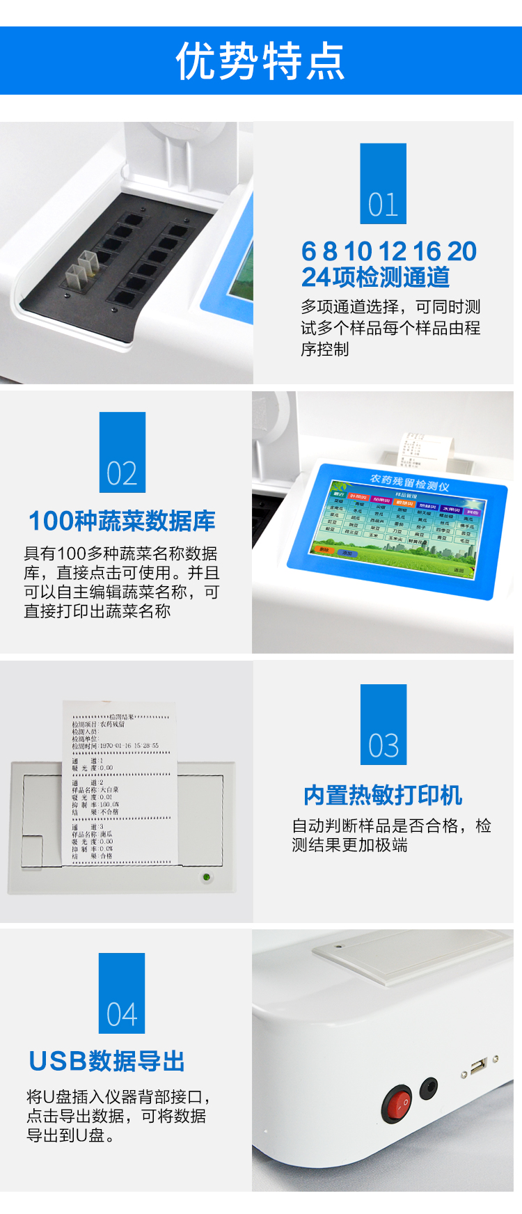 | 乙酰胆碱酯酶和丁酰胆碱酯酶试剂均可以使用,符合国家标准和农业部标准的要求。 | 自动判断样品是否合格,检测结果更加直观。 | 仪器具有100多种蔬菜名称菜单库,分类管理,并可按需添加或删除蔬菜名,编辑蔬菜名称,可直接打印出蔬菜名称。 | 检测通道:10个检测通道,可以同时测试多个样品,循环检测,即放即检,每个样品由程序控制分别独立工作,不会互相干扰。 | 智能操作系统,采用更加人性化操作,主控采用多核处理器,主频1.88Ghz,运转速度更快速,稳定性更强。 | 显示方式:7英寸高灵敏真彩触摸屏显示,人性化中文操作界面,读数直观、简单。 | 打印机采用串口5v打印,可选择手动打印或者自动打印,三分钟出打印结果,打印格式为检测人姓名、吸光度差值、检测时间、检测机构、样品名称及结果判定。 | 光源采用进口超高亮发光二极管,具有低功耗、高精度、稳定性强、光源可控可以关掉不使用的光源,响应速度快等优点。 | 智能恒流稳压,光强自动校准,长时间连续工作光源无温漂现象。 | 仪器具有GPRS远传功能,可插手机卡实现数据远传平台,wifi联网功能,可将数据快速上传电脑,进行数据管理与统计。 | 采用USB2.0接口设计,方便数据的存贮和移动,并可随时与计算机直接相连,并且可用计算机控制仪器。实现数据查询、浏览、分析、统计、打印等。 | 智能化程度高,仪器具有自检功能:具有开机自检和调零功能,具有自动检测重复性功能 | 仪器具有自身保护功能,可设置用户名及密码,防止非工作人员操作等。 | 采用DC12v直流供电,安全系统更高,并且配备6A锂电池充电器。 | 仪器具有重新校准、锁定、恢复出厂设置功能。 |