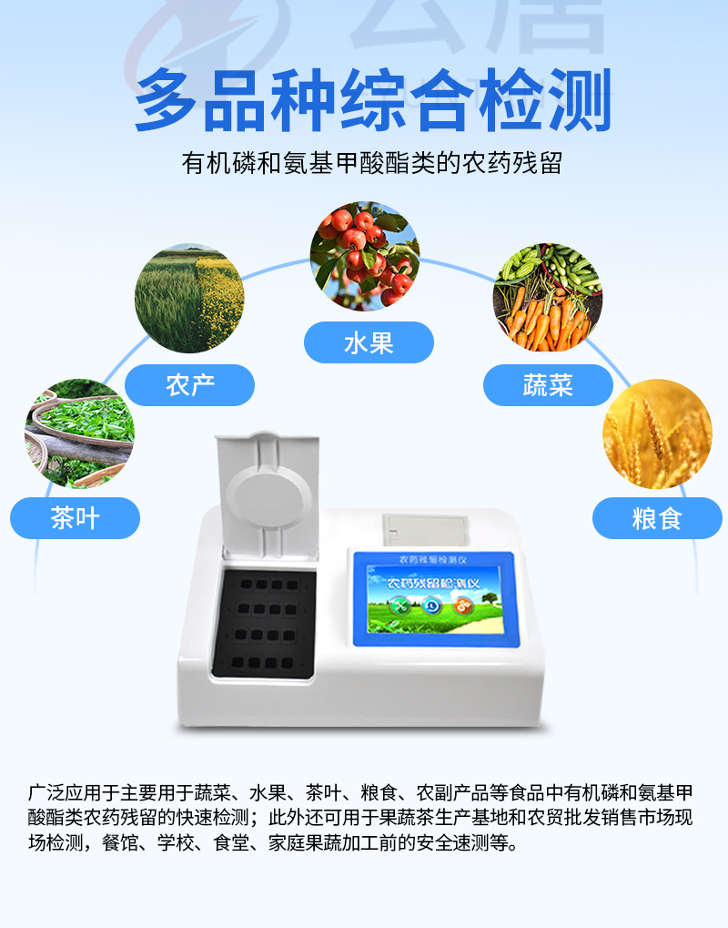 广泛应用于主要用于蔬菜、水果、茶叶、粮食、农副产品等食品中有机磷和氨基甲酸酯类农药残留的快速检测;此外还可用于果蔬茶生产基地和农贸批发销售市场现场检测,餐馆、学校、食堂、家庭果蔬加工前的安全速测等。