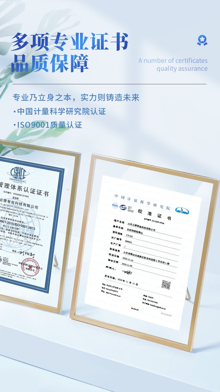 11、安全证书,放心保障:仪器具有中国计量科学研究院校准证书,使用放心。