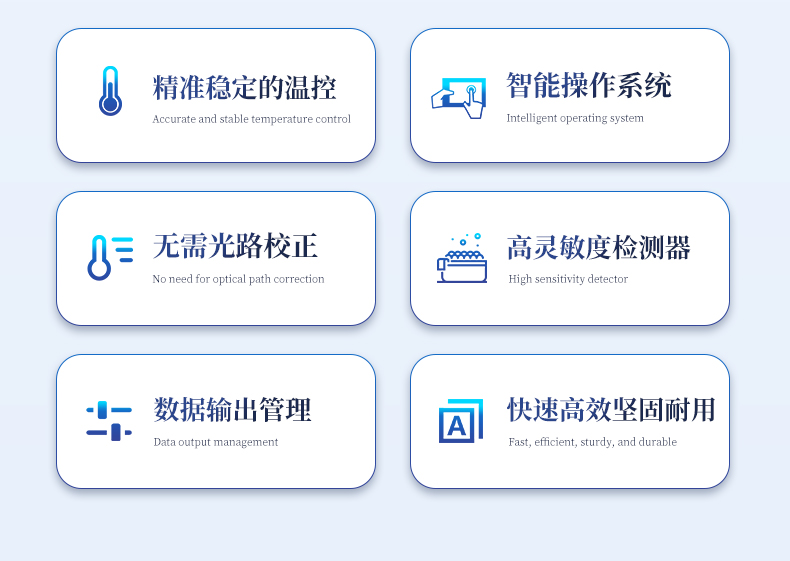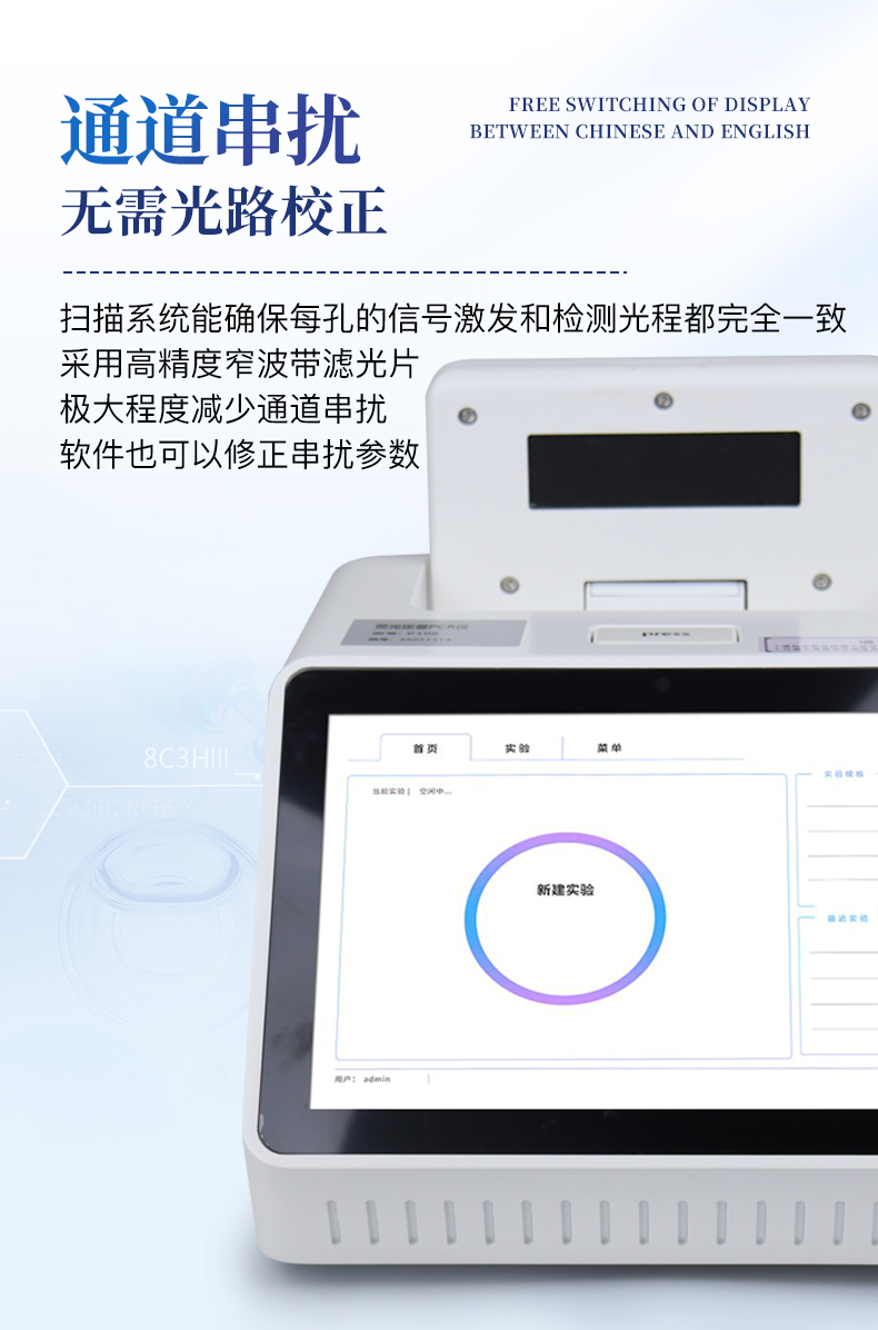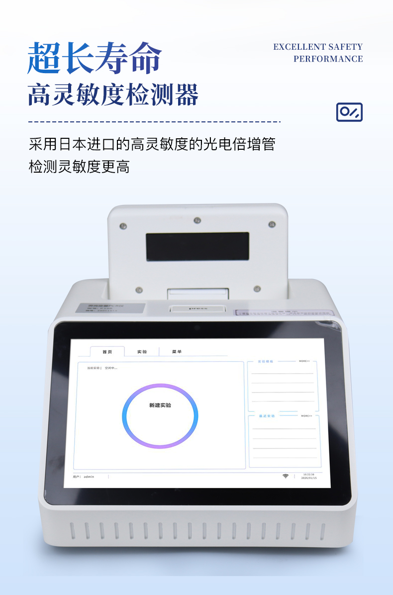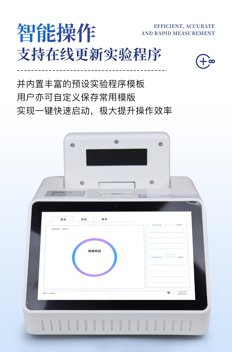 | 1.智能操作系统,实验尽在掌握 | A双模式灵活控制:支持通过仪器触摸屏独立运行,也支持通过电脑软件进行远程控制与数据管理,适应不同实验场景需求。 | B程序更新与预设:支持在线更新实验程序,并内置丰富的预设实验程序模板,用户亦可自定义保存常用模版,实现一键快速启动,极大提升操作效率。 | C极简启动体验(可选配):可定制集成摄像头扫描系统,用户只需扫描样品板或程序卡的二维码,即可自动识别并调用对应实验程序,简化流程,避免人为设置错误。 | D操作简单:无论是触摸屏界面还是电脑软件,均设计得直观易懂,新用户也能快速上手。预置常用程序模板,进一步简化操作流程。 | 2.精准稳定的温控与光学核心 | A长久精准的温控系统:采用进口***TEC半导体制冷模块,控温精准(±0.1°C),孔间温度均匀性**(≤±0.3°C)。系统稳定性卓越,长期使用性能衰减小,校准周期长达数年,显著降低维护成本与运营中断。 | B免维护的灵敏光学系统:配备4个独立LED光源与4个独立光电二极管检测器,实现四通道荧光同步精准检测。采用超长寿命进口光源,设计寿命期内免维护,无需额外校准或更换,保障检测结果长期一致性与高灵敏度。 | C卓越的数据质量:实验线性相关性高(R²≥0.999),重复性优异(孔间CV值低),确保定量结果准确可靠,数据置信度高。 | 3.**便捷的数据与输出管理 | A多重数据导出方式:支持通过USB存储设备直接拷贝,或经由Wi-Fi无线网络传输数据至本地服务器或云端,方便灵活,满足各类实验室数据管理习惯。 | B丰富的报告导出与打印:支持生成并导出多种格式(如PDF、Excel)的实验报告。仪器兼容USB热敏打印机、蓝牙无线打印机及常规A4打印机,可直接在仪器上或通过电脑一键导出并打印专业报告,便于结果存档与即时分享。 | 4.快速**与坚固耐用 | A升降温速度快:优化设计的温控系统具备高速升降温能力,显著缩短单次循环与整体检测时间,提升实验通量。 | B超长使用寿命:核心部件均选用工业级耐用材料与设计,整机运行稳定可靠,致力于为用户提供长久的投资回报。 |