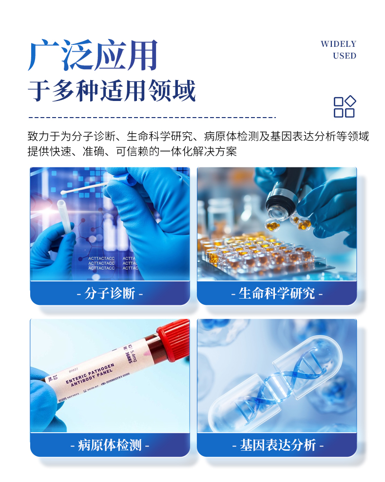 基础科学研究、病原体检测、肉制品掺假、转基因检测、食品安全检测、药物开发及合理用药、基因表达、水体监测、松材线虫检测、宠物检测、养殖业疫病检测