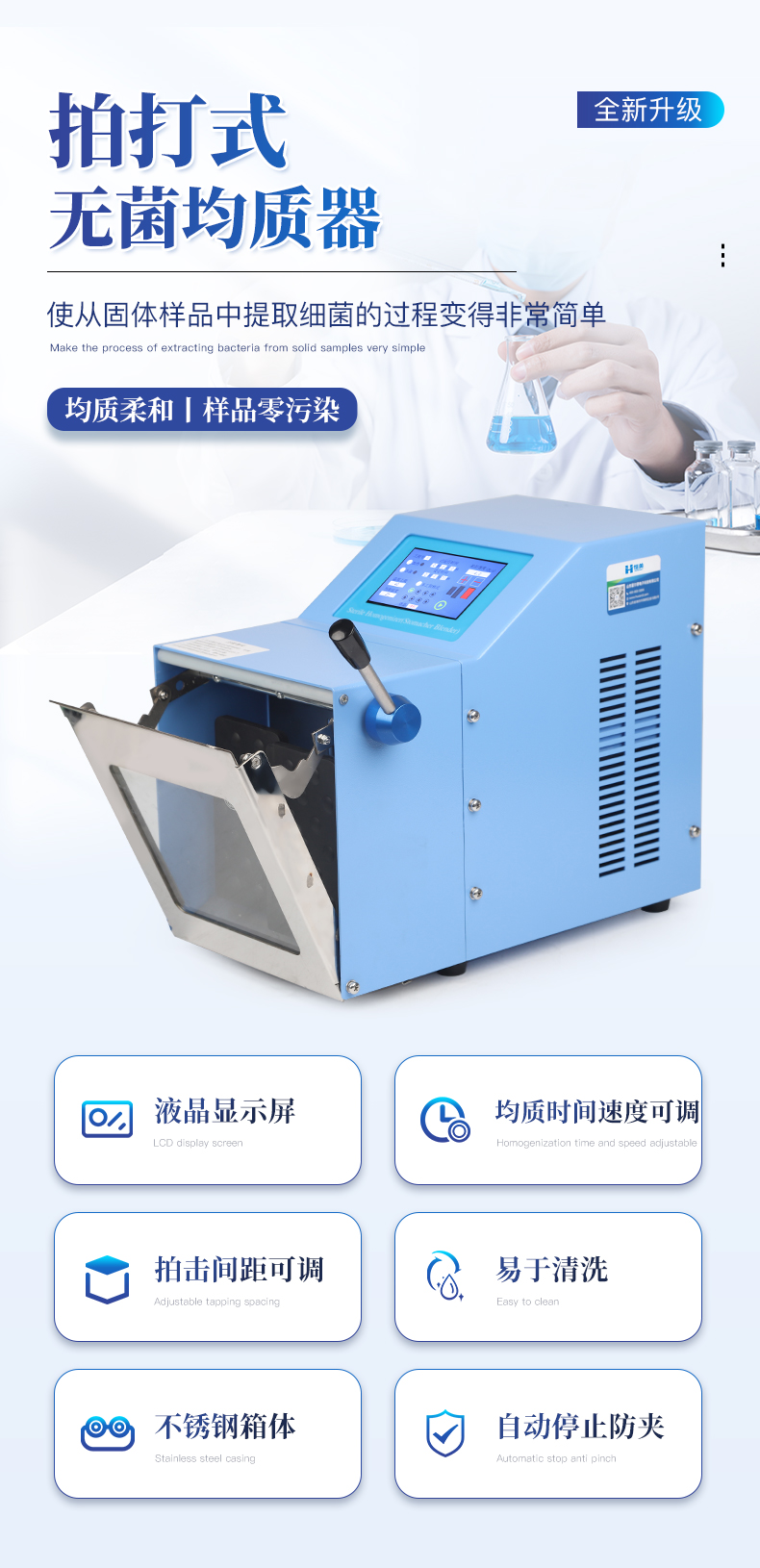 无菌均质器使从固体样品中提取细菌的过程变得非常简单,只需将样品和稀释液加入到无菌的样品袋中,然后将样品袋放入拍击式均质器中即可完成样品的处理。有效地分离被包含在固体样品内部和表面的微生物均一样品,确保无菌袋中混合全部的样品。处理后的样品溶液可以直接进行取样和分析,没有样品的变化和交叉污染的危险。