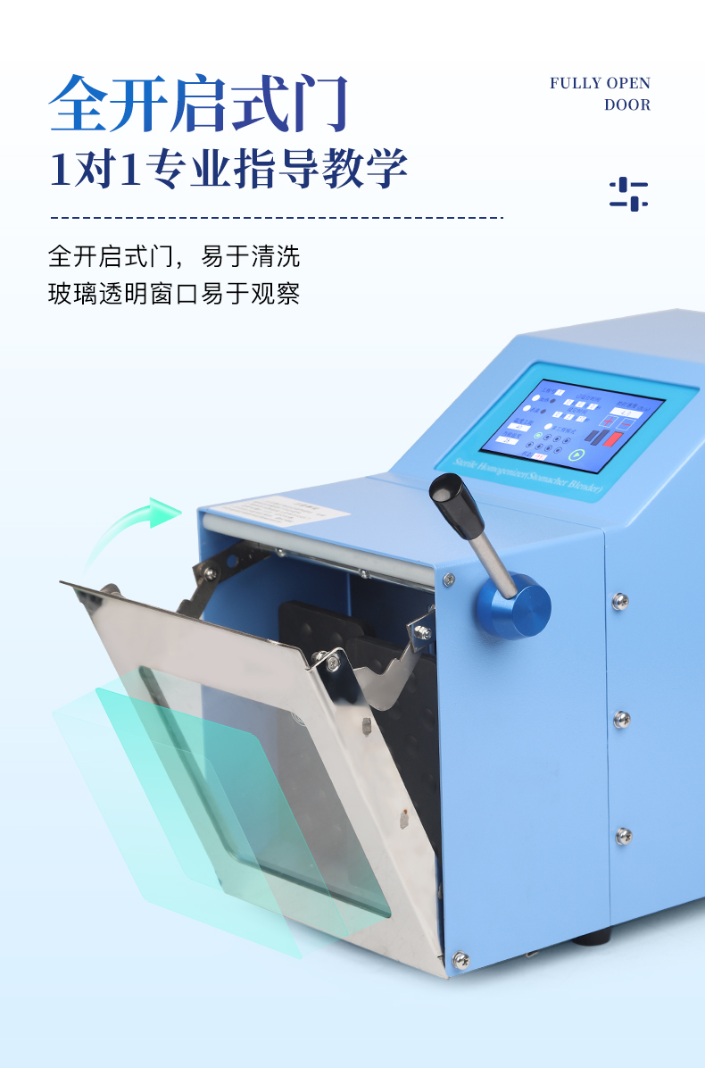 ●5英寸液晶显示屏。 ●可储存三组工作程序。 ●可调整的均质时间。 ●均质速度可调节或固定。 ●拍击器可调整前后距离。 ●无菌一次性滤袋,保证卫生。 ●全开启式门,易于清洗。 ●玻璃透明窗口易于观察 。 ●样品与均质仪无接触,如无样品泄露则不需进行系统清洗. ●均质柔和、样品零污染、无损伤、不升温、不需要灭菌处理,不需洗刷器皿。