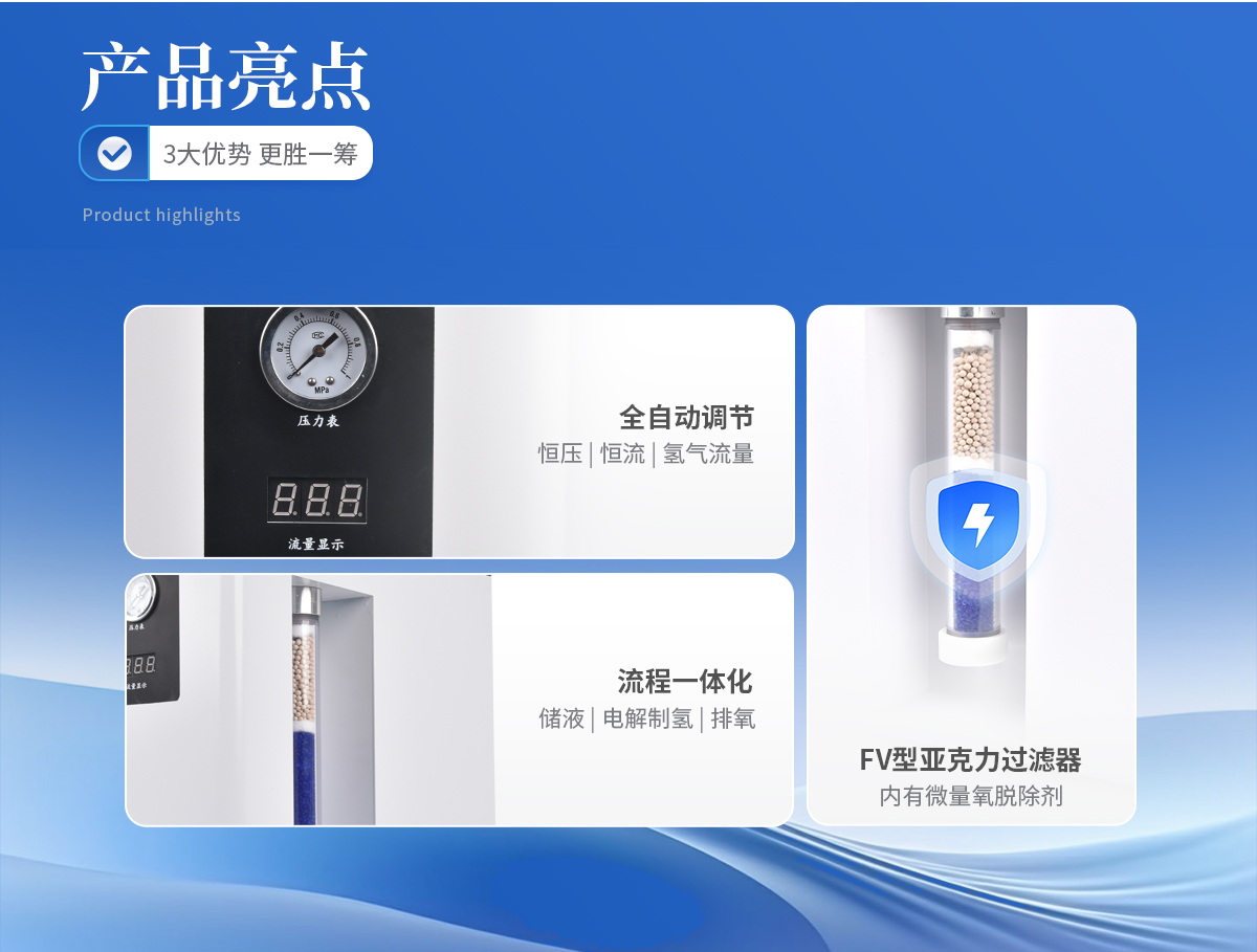 1、压力、流量自动显示,自动恒压、恒流、氢气流量可根据用量实现全自动调节。 2、FV型亚克力过滤器,内有微量氧脱除剂(不需要活化),氢气纯度更高;仪器内部采用硅橡胶圈(含硫量低),有效提高气体质量,保证色谱基线平稳。 3、储液、电解制氢、排氧一体化,池温低,寿命长久。 4、配有安全装置,灵敏可靠,自动防返碱。