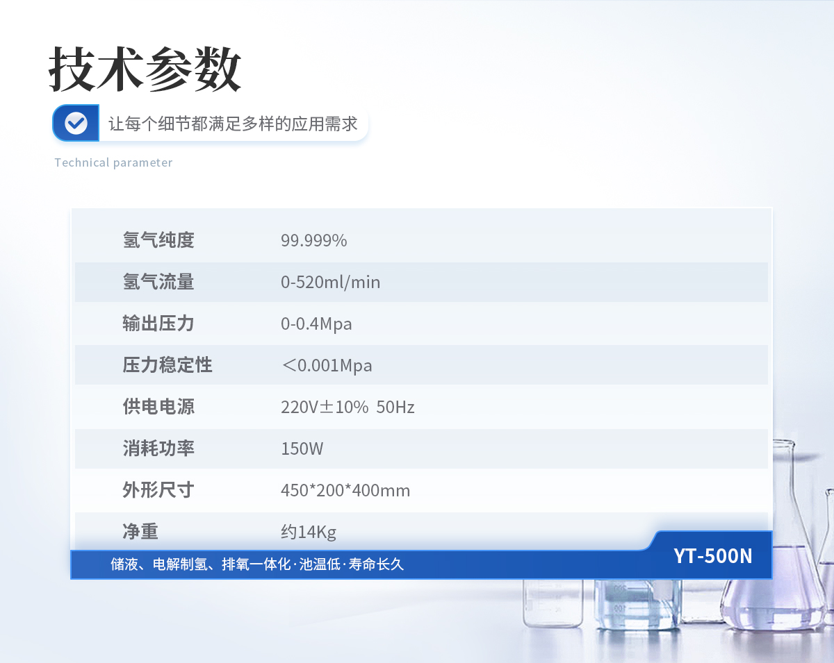 1、氢气纯度: 99.999% 2、氢气流量: 0-320ml/min 3、输出压力: 0-0.4Mpa 4、压力稳定性:<0.001Mpa 5、供电电源: 220V±10% 50Hz 6、消耗功率: 120W 7、外形尺寸: 450*200*400mm 8、净重: 约14Kg