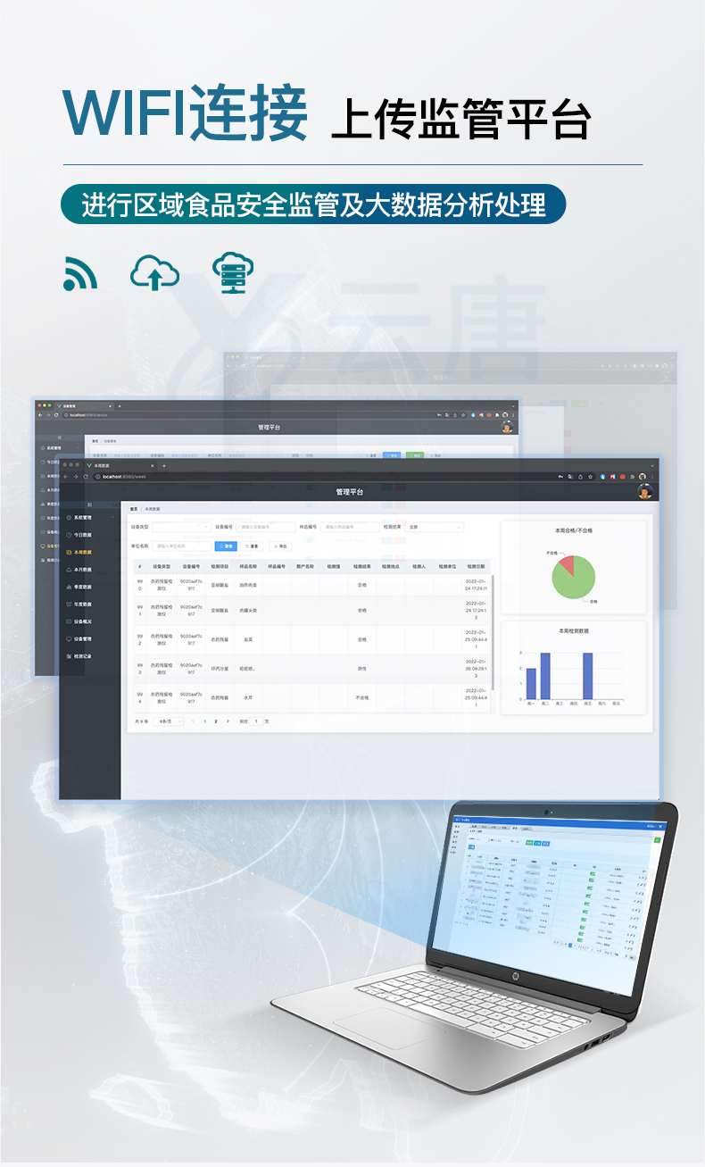 9.6、数据监管系统:同步对接监管平台,数据可局域网和互联网数据上传,检测结果可直接传至食品安全监管平台。进行区域食品安全监管及大数据分析处理与数据统计,监测区域食品安全长短期动态及问题预估、预警。