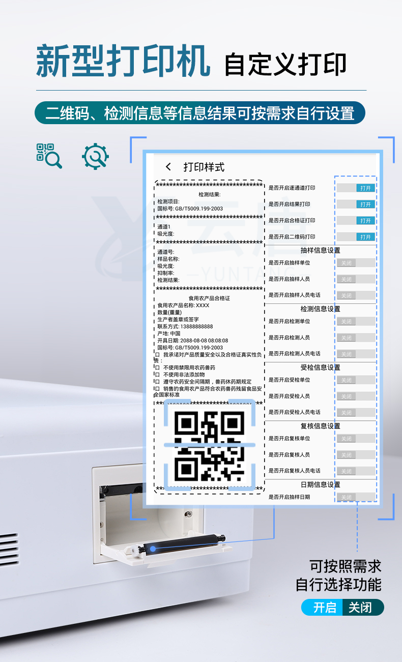9.7.1、全新打印系统:内置全新打印机,新创自定义打印方式,可按需灵活勾选控制:产品合格证(国家农业部标准要求),二维码,抽样信息、检测信息,受检信息、复核信息、抽样日期、检测日期等信息的打印。