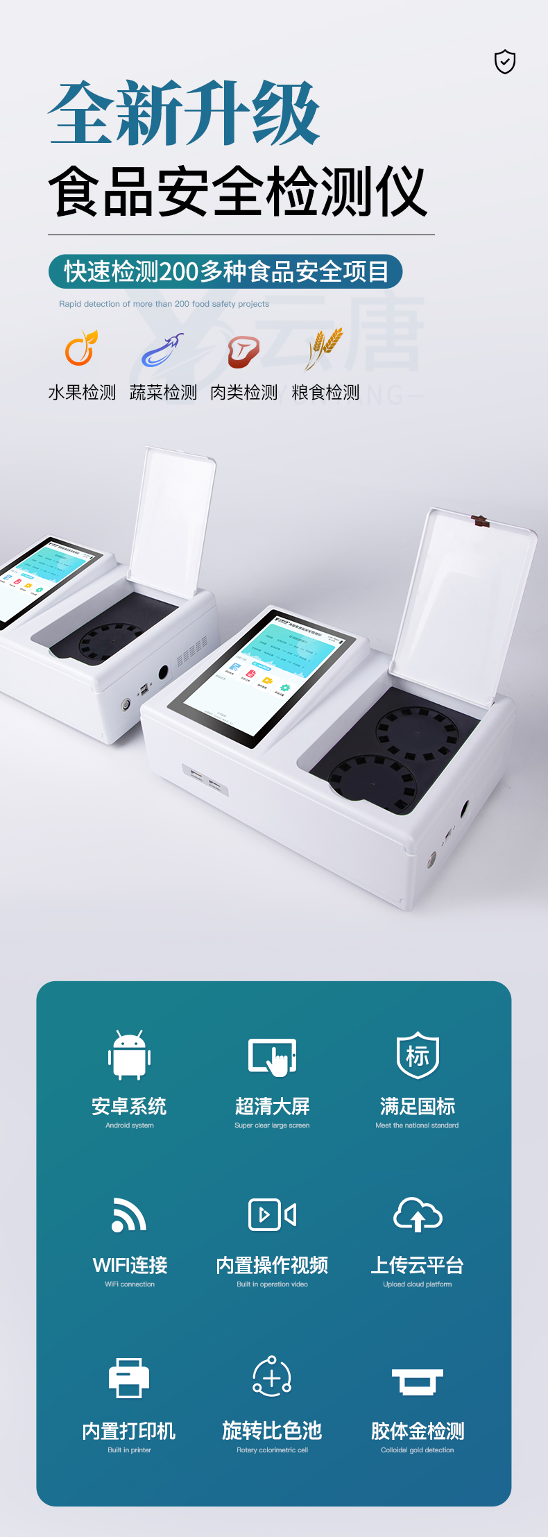 开云kaiyun官方网站生产的高智能食品安全检测仪为集成化食品安全快速检测分析设备,采用台式一体化设计,可快速检测200多种食品安全项目,包含非食用化学物质、滥用食品添加剂、农药残留、兽药残留、重金属、病害肉、营养强化剂、抗生素类残留、激素类残留、真菌毒素类残留、化学类残留等项目的定性定量检测。
