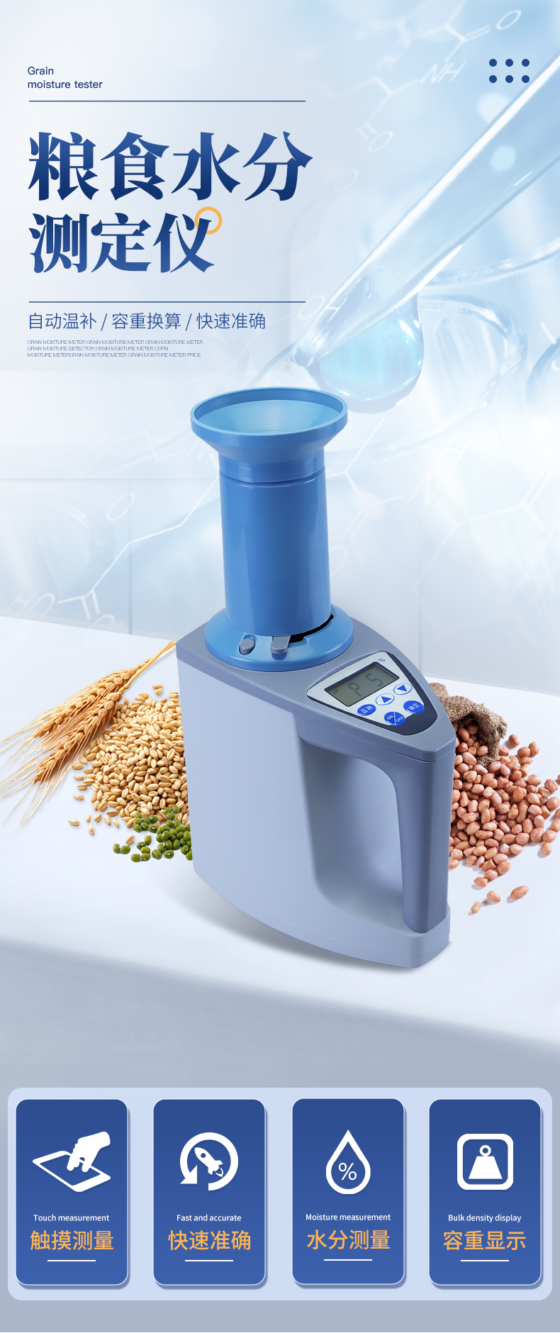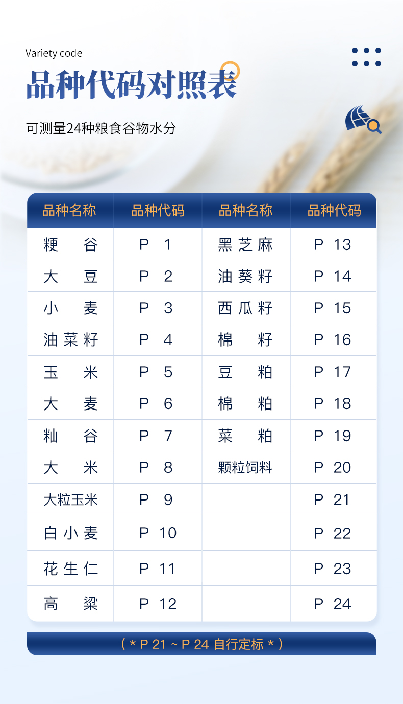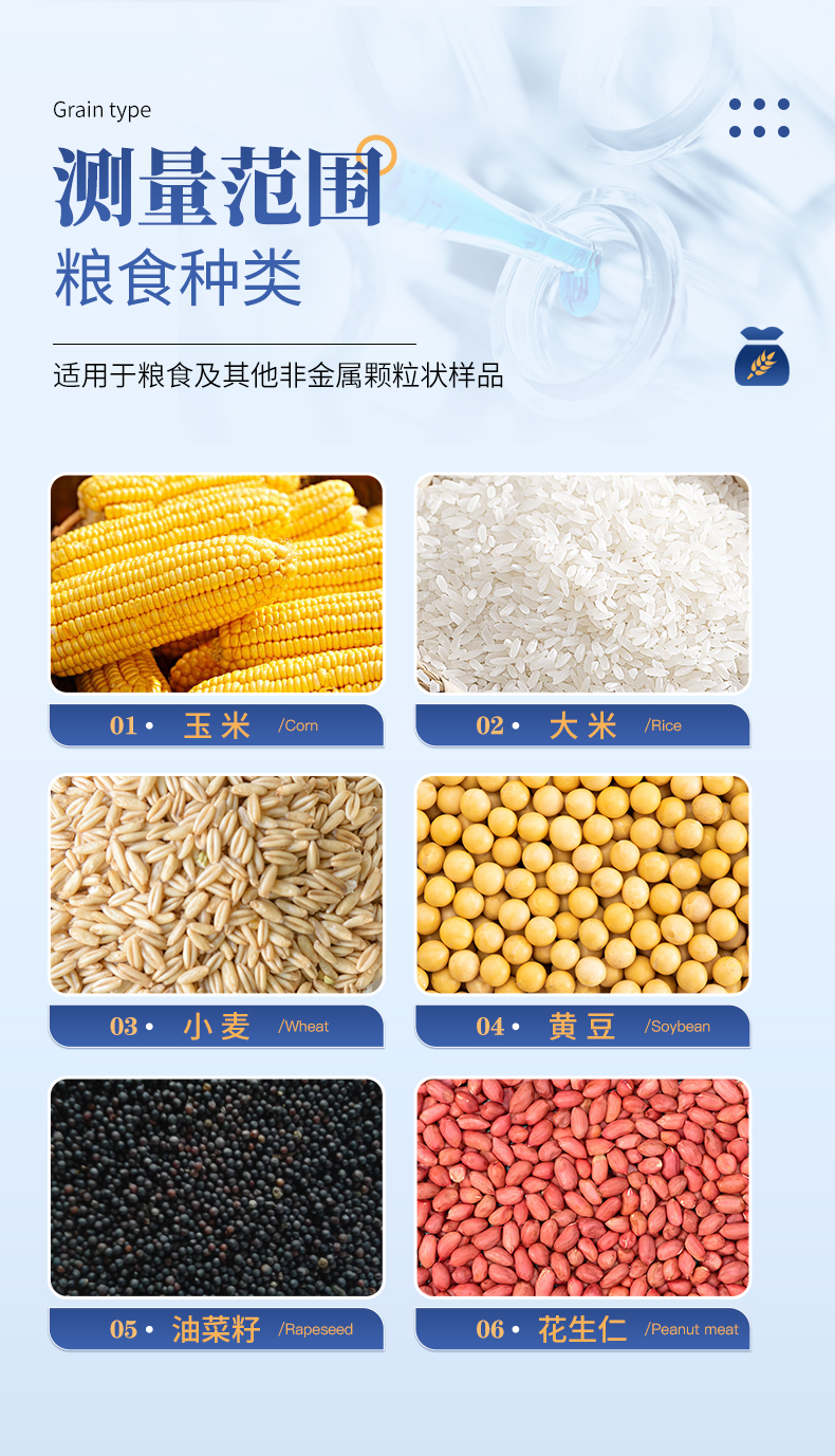 测量范围:可测量谷类、玉米、东北玉米、大麦、小麦、白小麦、大米、豆粕、花生仁、菜粕、高粱、黑芝麻、棉籽、棉粕、籼谷、大豆、油菜籽、饲料、蔬菜种子等非金属颗粒状物质。
