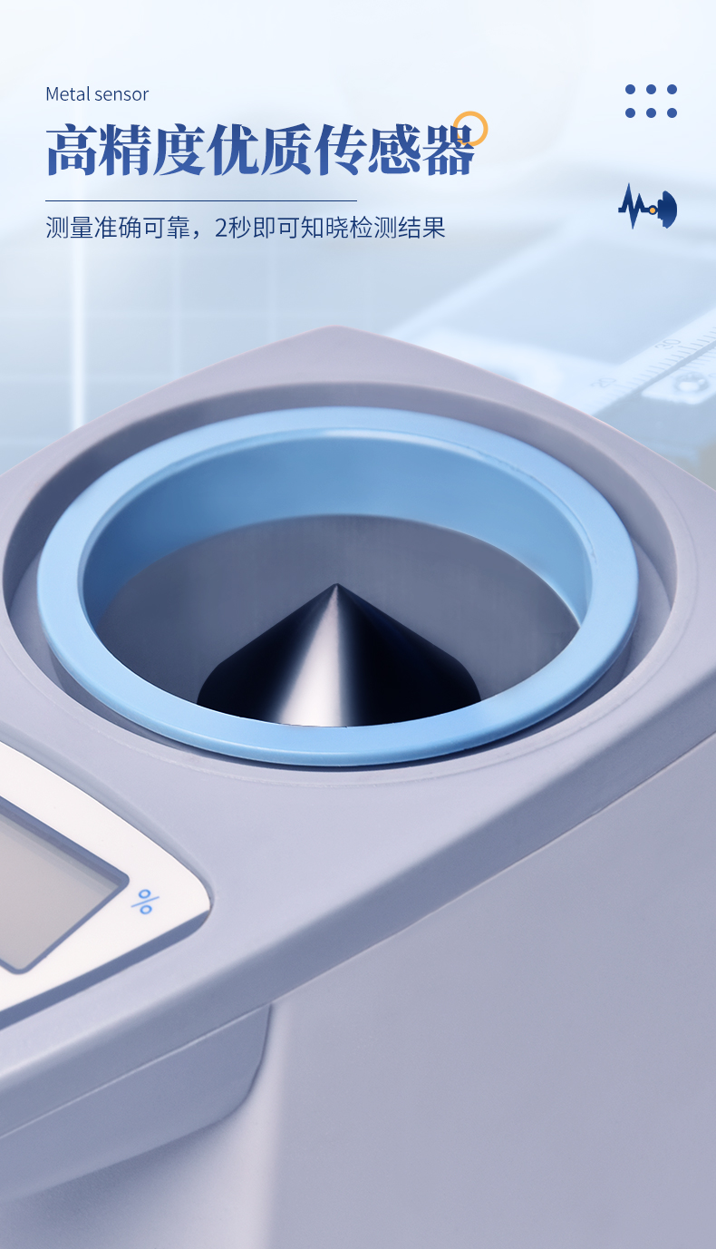 操作简单:20个常见品种已预先定标,不需秤样、用料简取样后可立即测量水分