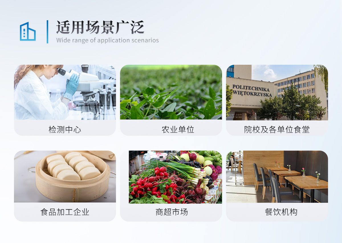 广泛应用于食品深加工企业、食药监局、商场超市、质量监督检验、工商管理、餐饮检测、各大食品安全监测系统等单位使用。