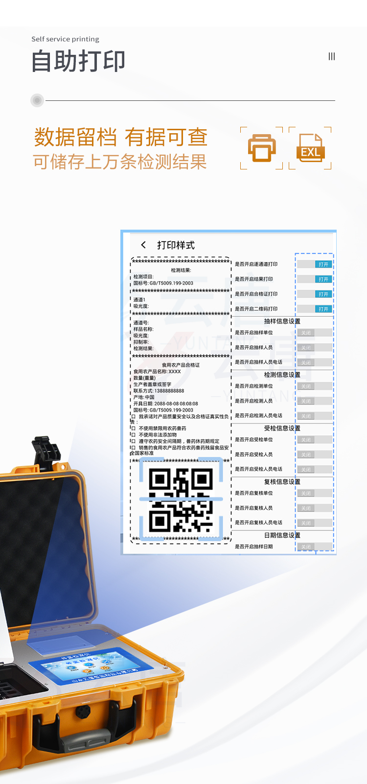 5、配备新一代嵌入式热敏打印机,可选择手动打印或者自动打印,检测完成可自动打印检测报告和二维码。