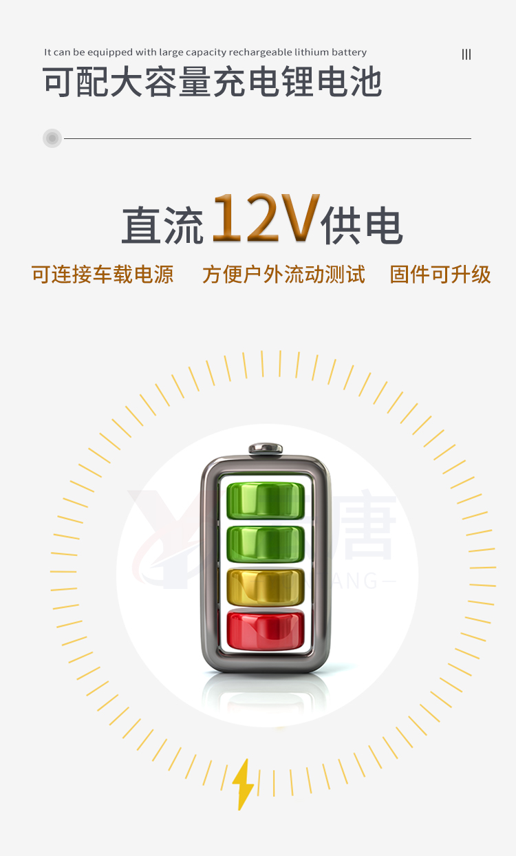 2、直流12V供电,可连接车载电源,可配6ah大容量充电锂电池,方便户外流动测试。