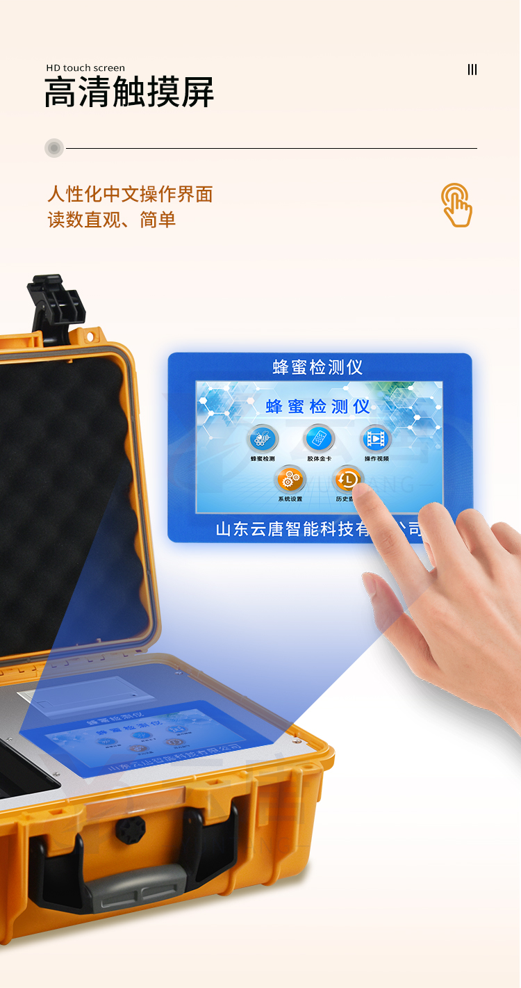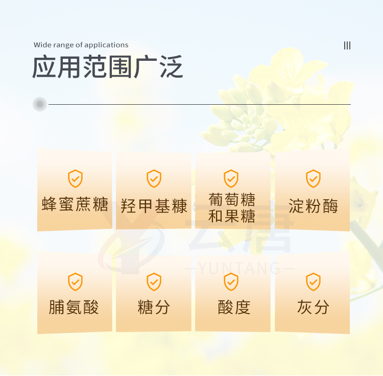 检测项目:蜂蜜蔗糖、蜂蜜还原糖(葡萄糖和果糖)、蜂蜜羟甲基糠醛、蜂蜜酸度、蜂蜜中农药残留、蜂蜜淀粉酶值、蜂蜜中脯氨酸、蜂蜜水分、蜂蜜糖分、蜂蜜中灰分,应用范围:应用于现场检测蜂蜜蔗糖、葡萄糖和果糖、羟甲基糠醛、酸度、农残、淀粉酶、脯氨酸、水分、糖分、灰分含量的蜂蜜快速检测仪,可广泛应用于各类蜂蜜品质的快速定量检测。