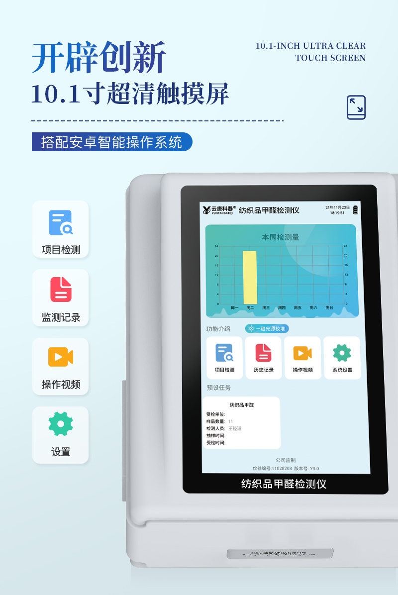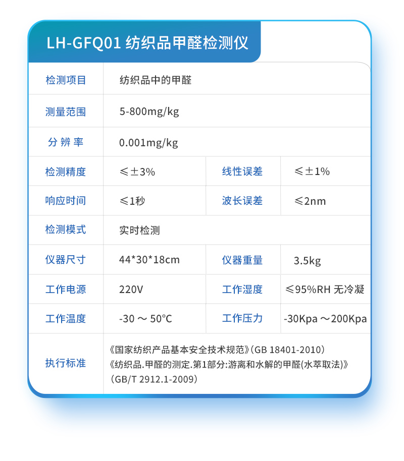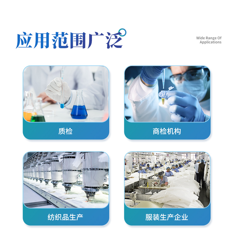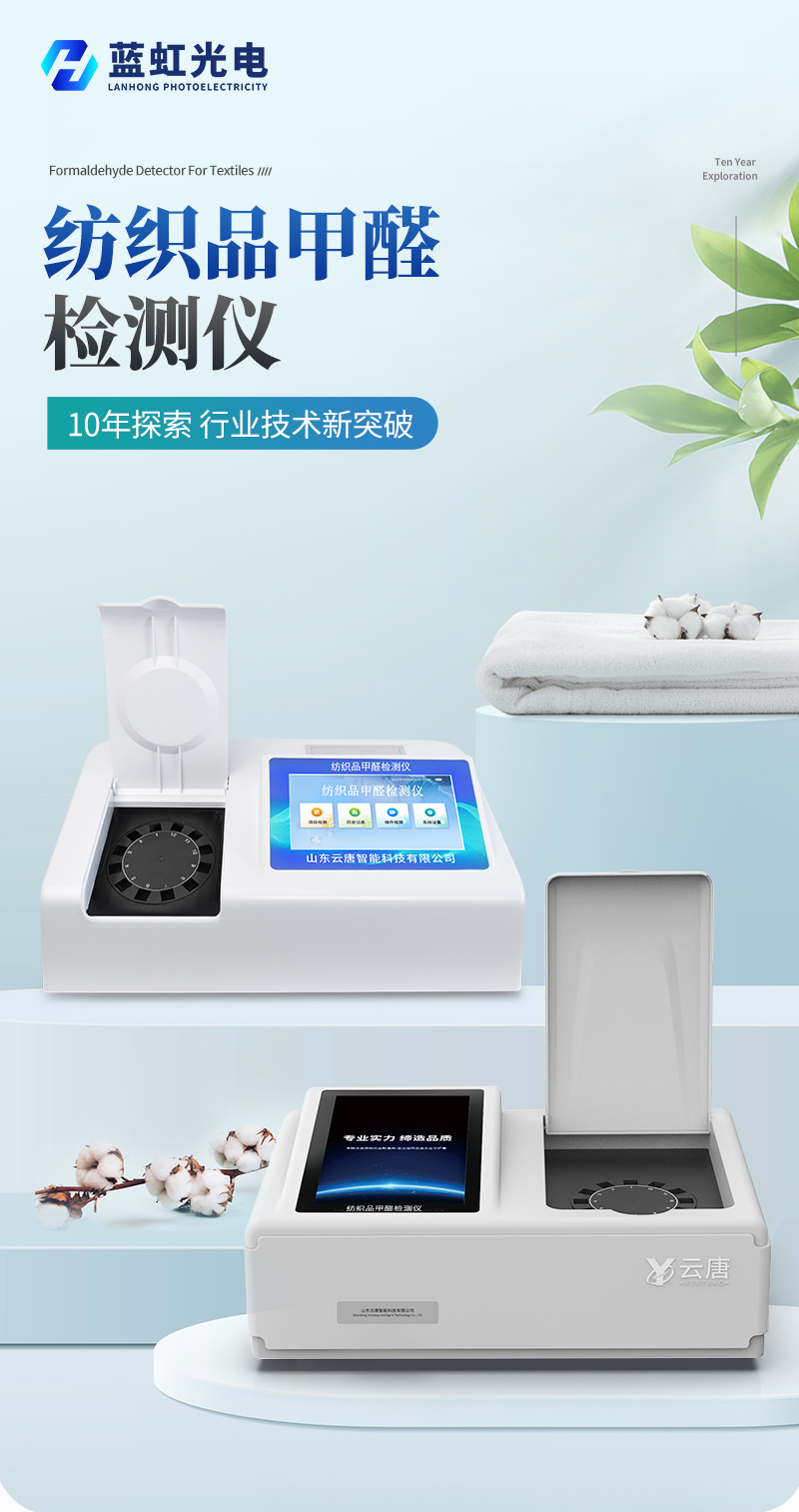 该纺织品甲醛检测设备满足纺织品甲醛含量检测的中国标准《国家纺织产品基本安全技术规范》(GB 18401-2010)、《纺织品.甲醛的测定.第1部分:游离和水解的甲醛(水萃取法)》(GB/T 2912.1-2009), 适合各种纺织品、服装等的甲醛含量检测。