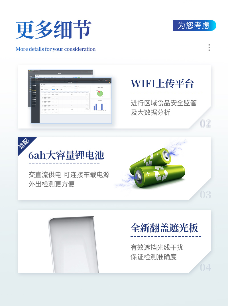 ⑦ 该仪器模块化高度集成,同步设有数字化管理模块、无线通讯模块,可将检测结果进行分析,直接上传至数据平台,实现数据共享,方便后期进行数据分析与统计。