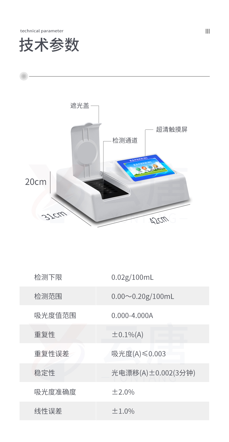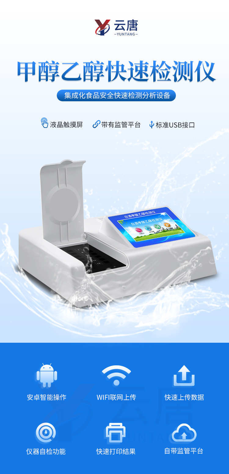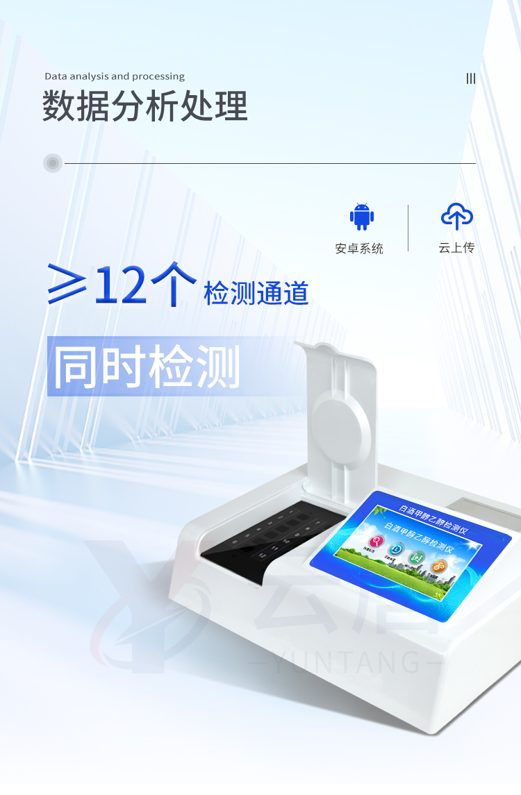 1、 检测项目:可快速检测各类食品中的甲醛的含量,仪器预留其他项目检测程序和端口,根据日后需求可方便的自主增加检测项目。日后可升级为检测,水产品,肉制品,面制品的综合类型仪器。