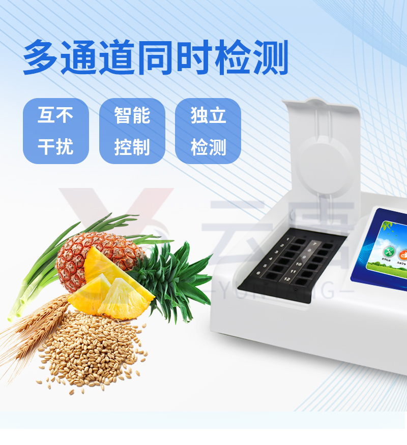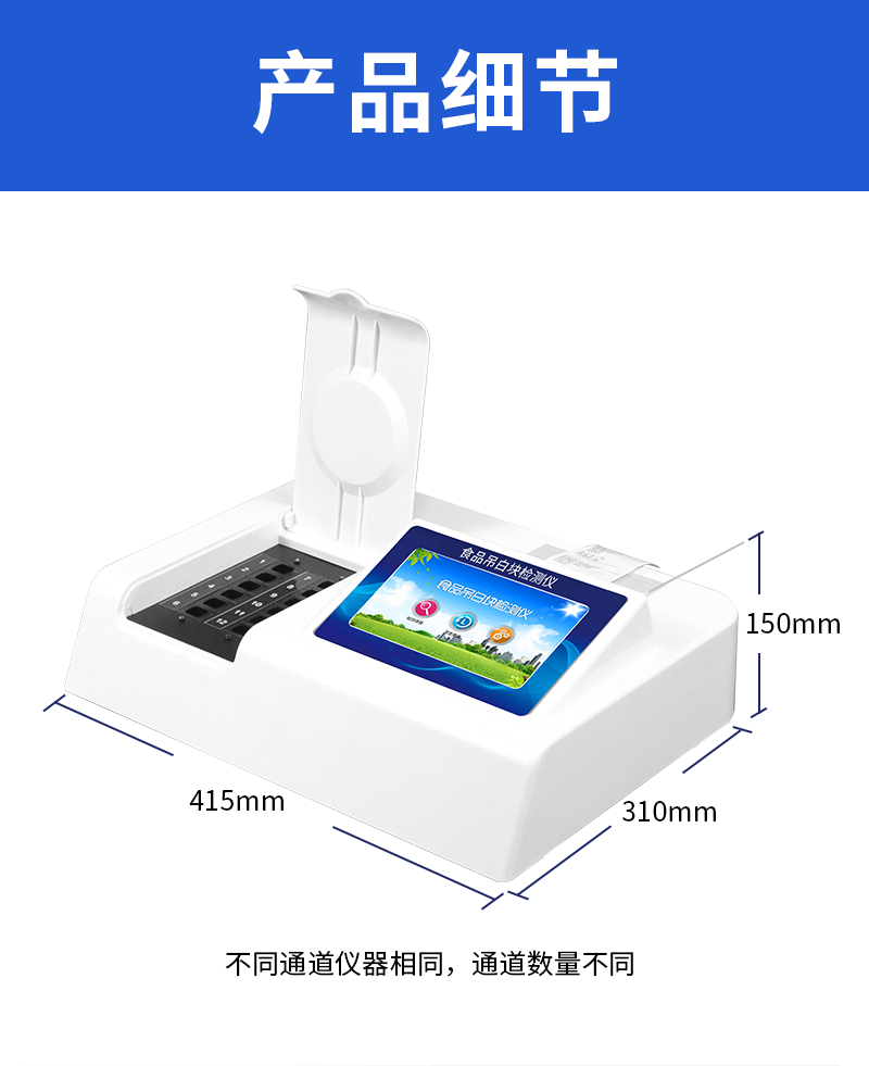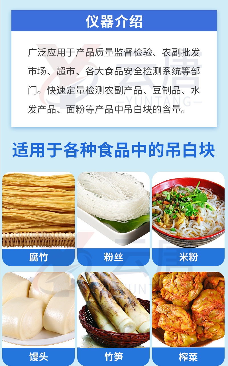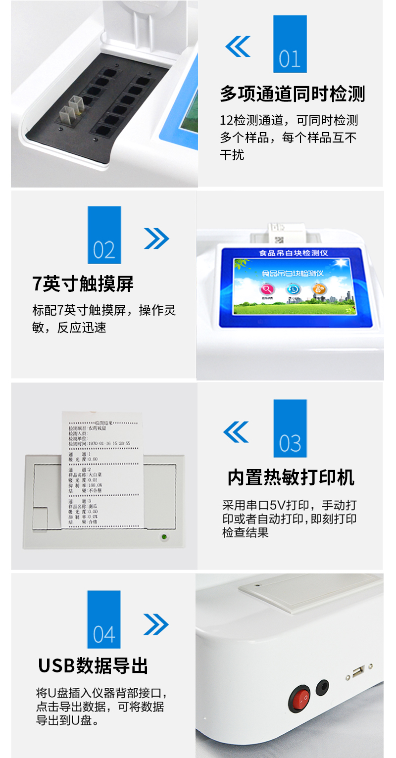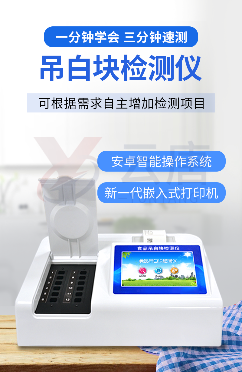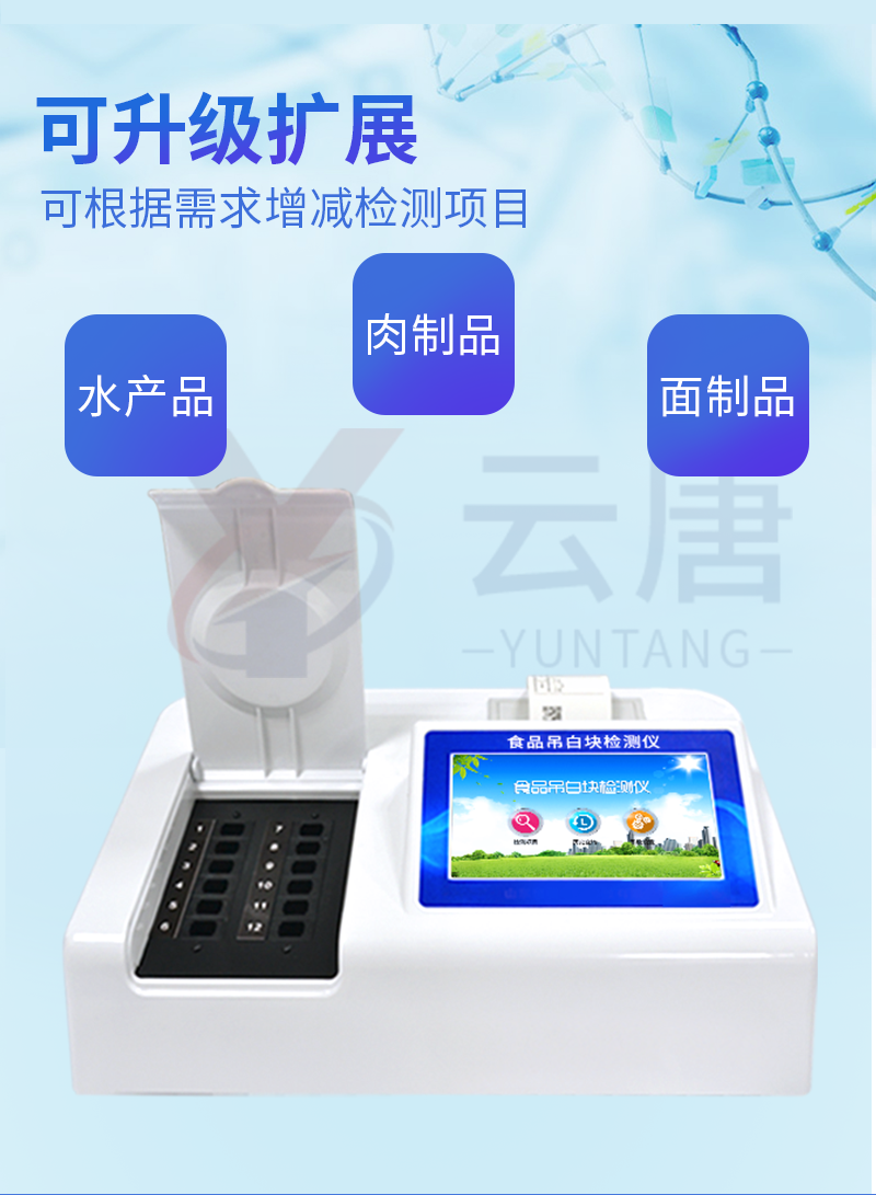 1、 检测项目:用于快速检测食品中吊白块,仪器预留其他项目检测程序和端口,根据日后需求可方便的自主增加检测项目。日后可升级为检测,水产品,肉制品,面制品的综合类型仪器。