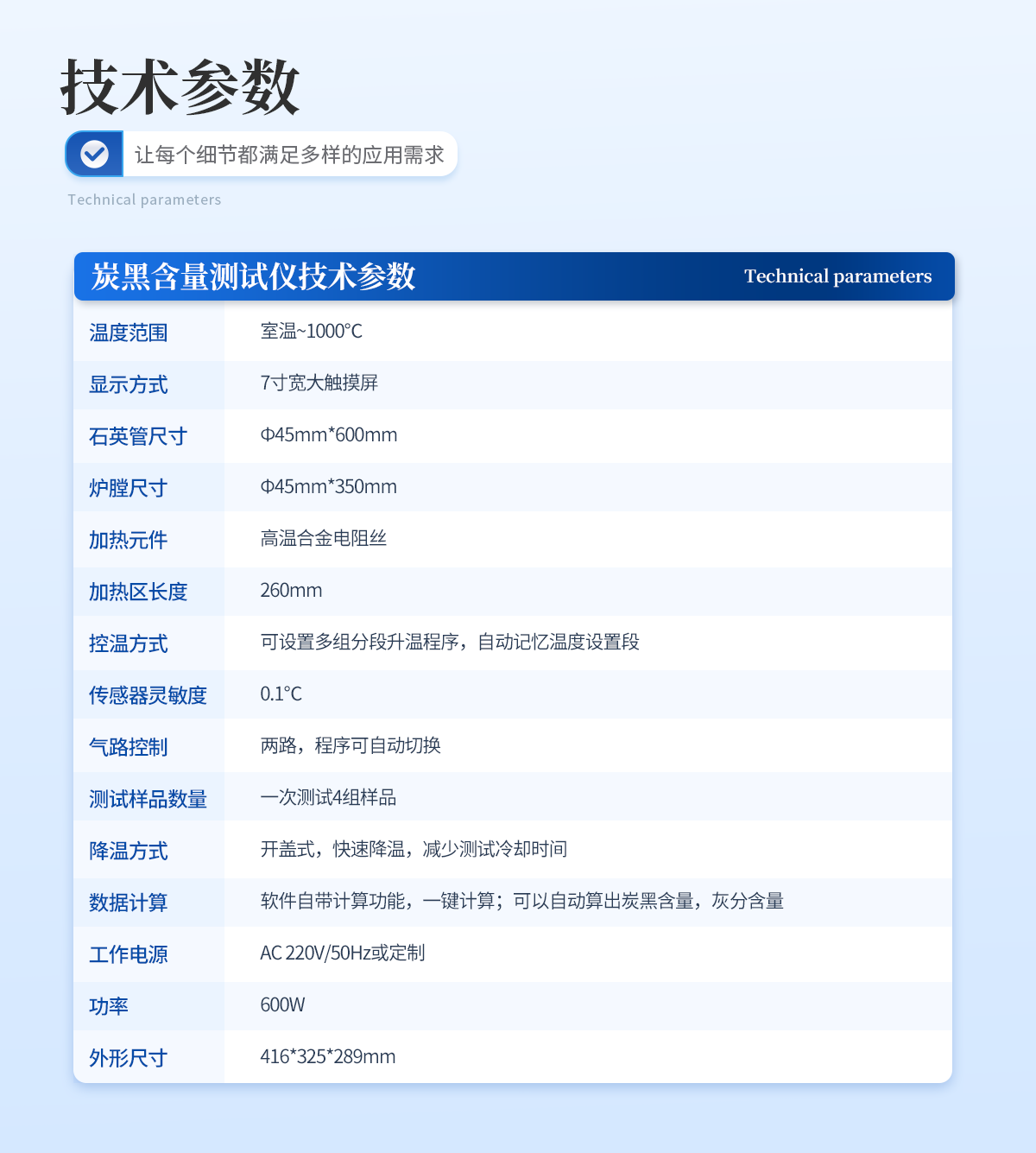 | 1.温度范围:室温~1000℃ | 2. 显示方式:7寸宽大触摸屏 | 3.石英管尺寸:Ф45mm*600mm | 4. 炉膛尺寸:Φ45mm*350mm | 5.加热元件:高温合金电阻丝 | 6.加热区长度:260mm | 7.控温方式:可设置多组分段升温程序,自动记忆温度设置段 | 8. 传感器灵敏度:0.1℃ | 9.气路控制:两路,程序可自动切换 | 10. 测试样品数量:一次测试4组样品 | 11.降温方式:开盖式,快速降温,减少测试冷却时间 | 12.数据计算:软件自带计算功能,一键计算;可以自动算出炭黑含量,灰分含量 | 13.工作电源 AC:220V/50Hz或定制 | 14.功率:600W | 15.外形尺寸:416*325*289mm |