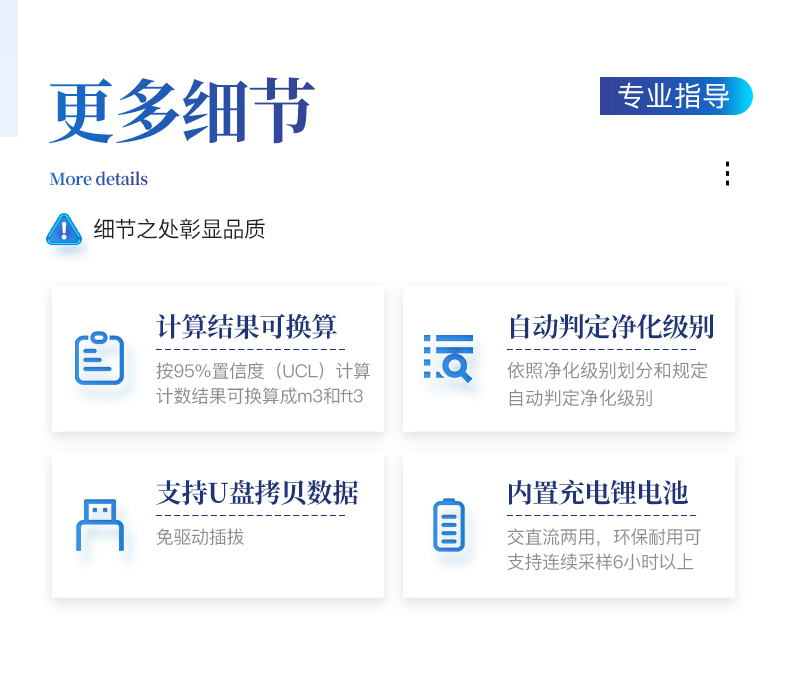 1、安卓系统7.1版本,操作交互体验更好。 2、内置温湿度传感器、环境气压传感器 3、核心部件光散射传感器明显消除腔体的杂散光,信噪比大为提高。从而使测量更准确更可靠。 4、按95%置信度(UCL)计算,计数结果可换算成m3和ft3 5、依照净化级别划分和规定,自动判定净化级别,使用便利。 6、带审计追踪功能,可查询、可追溯、可控制,符合FDA 21CFR PART11规范 7、支持wifi、蓝牙传输,数据可无线上传;同时支持U盘拷贝数据,免驱动插拔。 8、配置监管平台,检测结果可直接无线传至平台,进行洁净度长短期分析,辅助管理。 9、内置新一代高速热敏打印机,可选择所需要打印的粒径通道,灵活打印结果。 10、交直流两用,内置充电锂电池,环保耐用可支持连续采样6小时以上。 11、便捷简易伸缩式云台支架,安装采样操作更加方便。