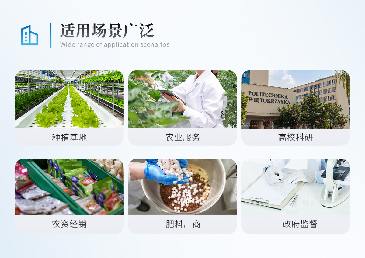 配套齐全:该仪器集药、器、仪为一体,携带方便,相当于一个小型移动实验室,无需用户自配附件,亦可灵活野外流动测试。适于农业服务部门或农资经销商、合作社、肥料厂商、大种植户测土施肥和鉴别肥料真假。