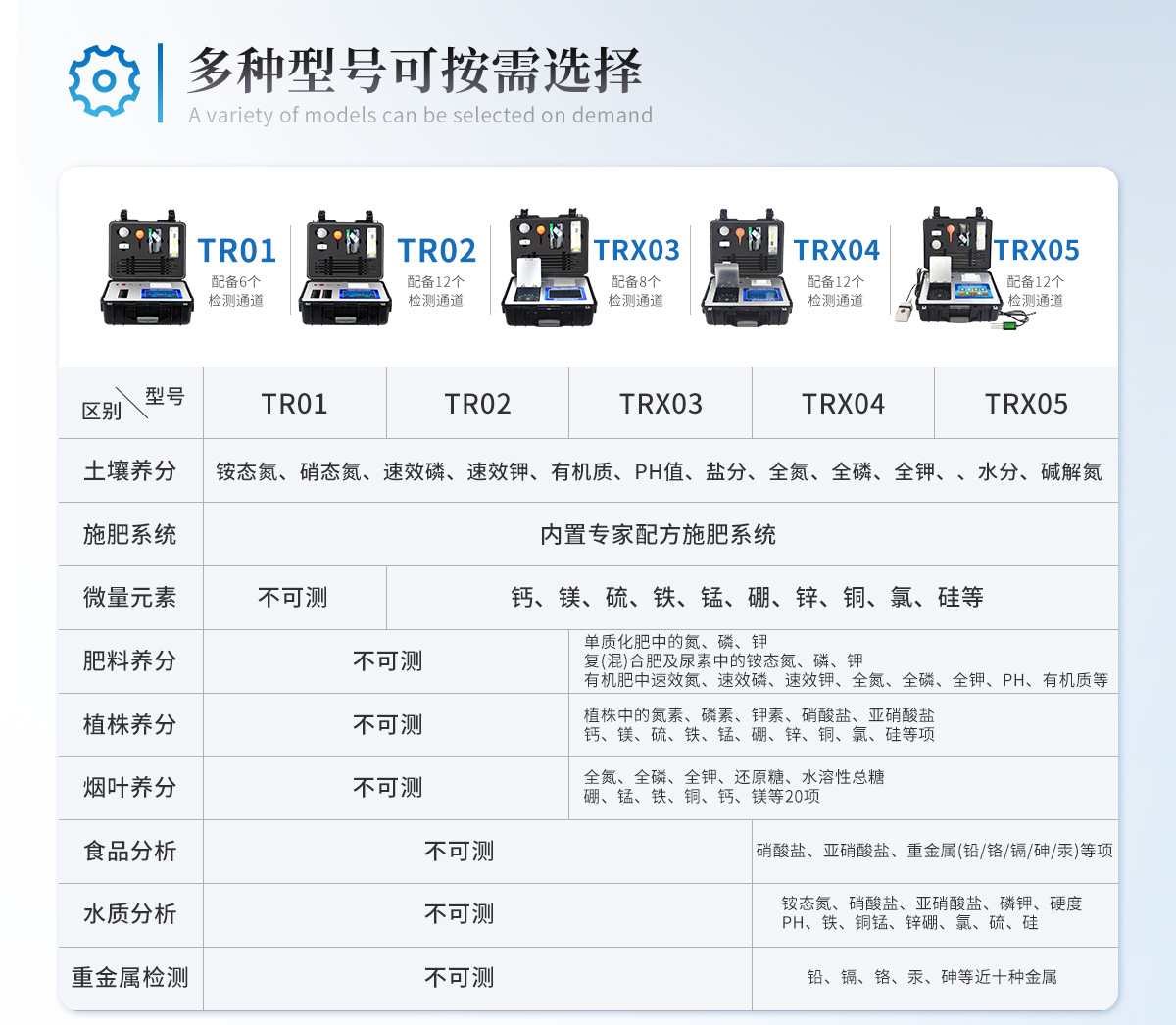 测试一个肥料样(N、P、K)≤50分钟,同时检测三个肥料样品(N、P、K)≤1.5小时。