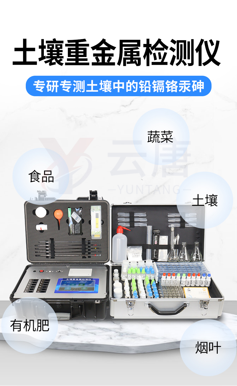 土壤重金属污染问题日益严重,造成土壤耕作层内的镉、铜、砷、铬、汞、铁、锌、锰、铜、铝等重金属大量富积、积累,成为当下面临的主要环境问题之一。土壤中的重金属通过在作物体内富集进入食物链,对人畜健康造成严重威胁。有色金属矿山的开采、 工业“三废”的排放、含重金属废弃物堆积、农业生产中的污水灌溉,农用化学药品的不合理使用等,都可能导致有害重金属元素直接或间接进入土壤,导致土壤、作物、果蔬、水质、水产品等重金属含量严重超标。但是当前重金属测定方法测定速度慢、步骤繁琐且仪器昂贵。基于这种形势,我们开发出了重金属快速测定方法。