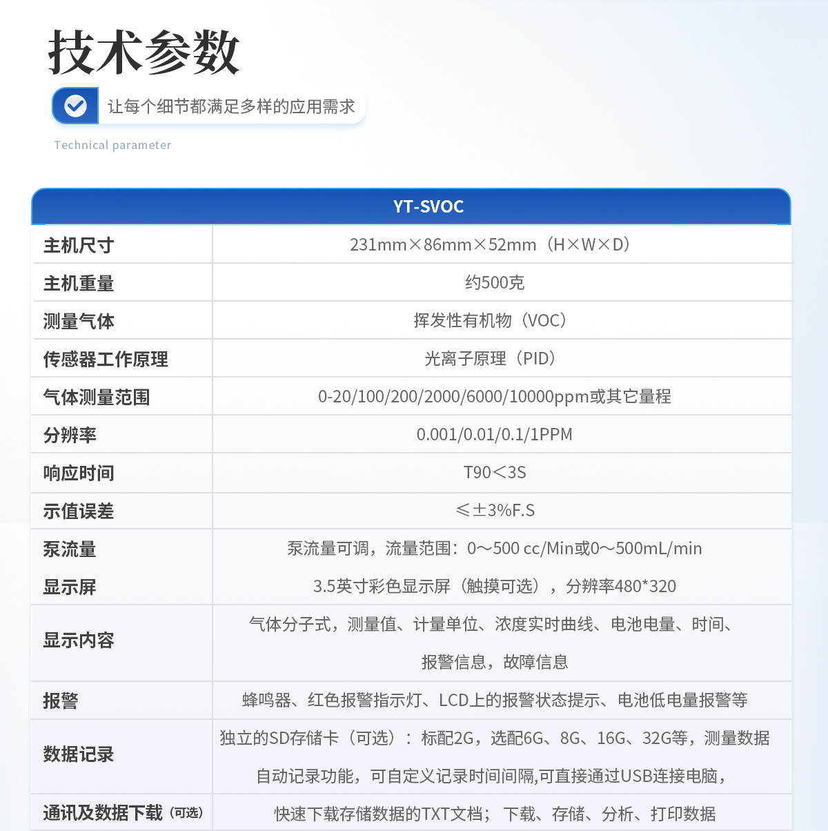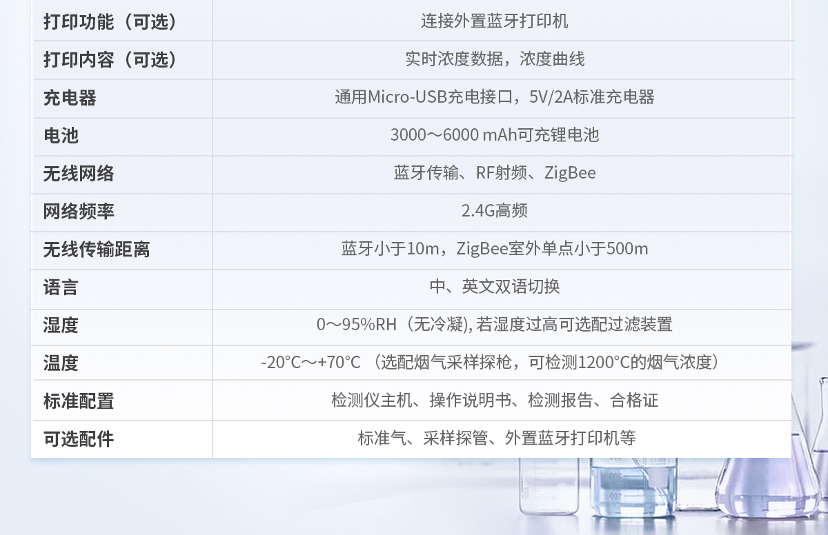 主机尺寸:(H x W x D)231*86*52mm 主机重量:约500克 测量气体:挥发性有机物(VOC) 传感器工作原理:光离子原理(PID); 气体测量范围 :0-20/100/200/2000/6000/10000ppm或其它量程 分辨率:0.001/0.01/0.1/1PPM 响应时间 :T90<3S 示值误差: ≤±3%F.S 泵流量:泵流量可调,流量范围:0~500 cc/Min或0~500mL/min 显示屏:3.5寸彩色显示屏(触摸可选),分辨率480*320 显示内容:气体分子式,测量值、计量单位、浓度实时曲线、电池电量、时间、报警信息,故障信息 报 警:蜂鸣器、红色报警指示灯、LCD上的报警状态提示、电池低电量报警等 数据记录:独立的SD存储卡(可选):标配2G,选配6G、8G、16G、32G等 测量数据自动记录功能,可自定义记录时间间隔 通讯及数据下载 (可选):可直接通过USB连接电脑,快速下载存储数据的TXT文档; 下载、存储、分析、打印数据 打印功能(可选):连接外置蓝牙打印机 打印内容(可选):实时浓度数据, 浓度曲线 充电器:通用Micro-USB充电接口,5V/2A标准充电器 电池:3000~6000 mAh可充锂电池 无线网络:蓝牙传输、RF射频、ZigBee 网络频率 :2.4G高频 无线传输距离 :蓝牙小于10m,ZigBee室外单点小于500m 语 言:中、英文双语切换 湿 度:0~95%RH(无冷凝), 若湿度过高可选配过滤装置 温 度:-20℃~ +70℃ (选配烟气采样探枪,可检测1200℃的烟气浓度)