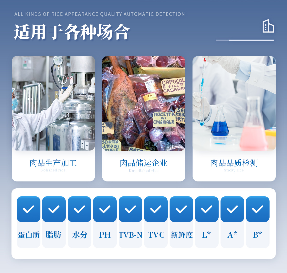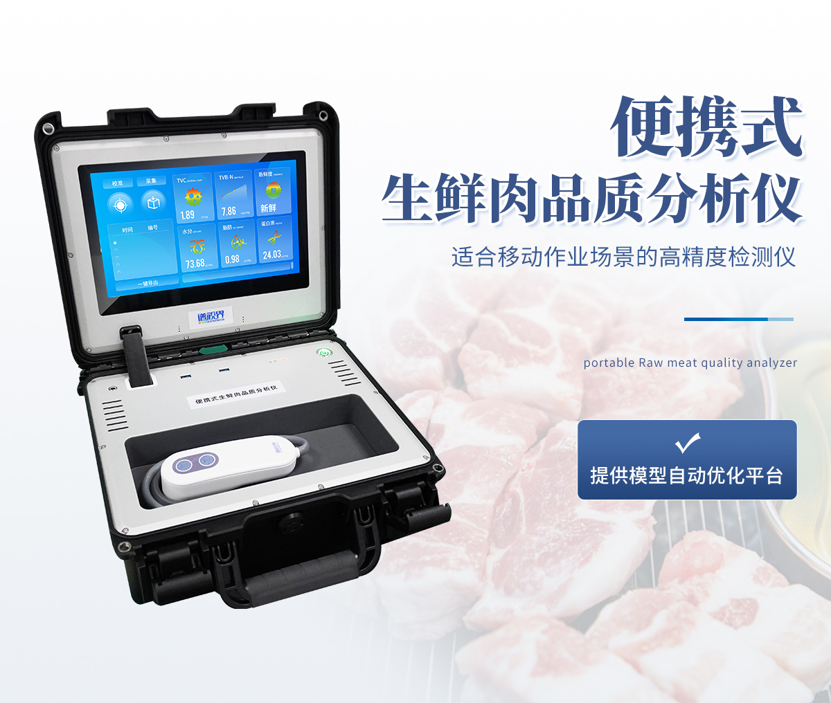 可用于检测生鲜肉的蛋白质、脂肪、水分、pH、TVC、TVB-N、新鲜度、L*、A*、B*等品质参数。配备手提箱式防水减震外壳、大尺寸触控屏幕并内置大容量电池,可一键自动校准,是一款适合移动作业场景的高精度生鲜肉品质检测仪,其可用于生鲜肉及肉品生产、加工、储运企业、肉品品质监管部门等。