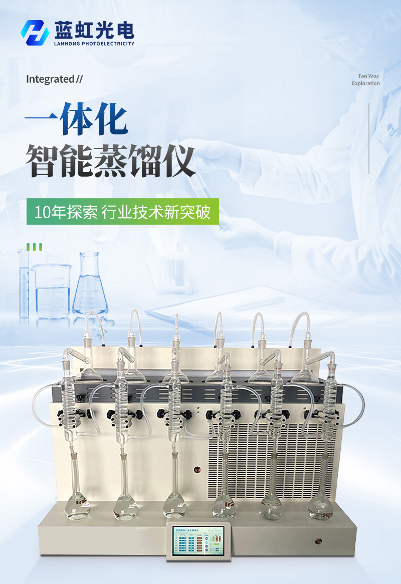 智能一体化蒸馏仪是根据实验室蒸馏预处理操作规程,集恒温加热、蒸馏终点自动控制、冷却水循环于一体的新型智能蒸馏处理装置。