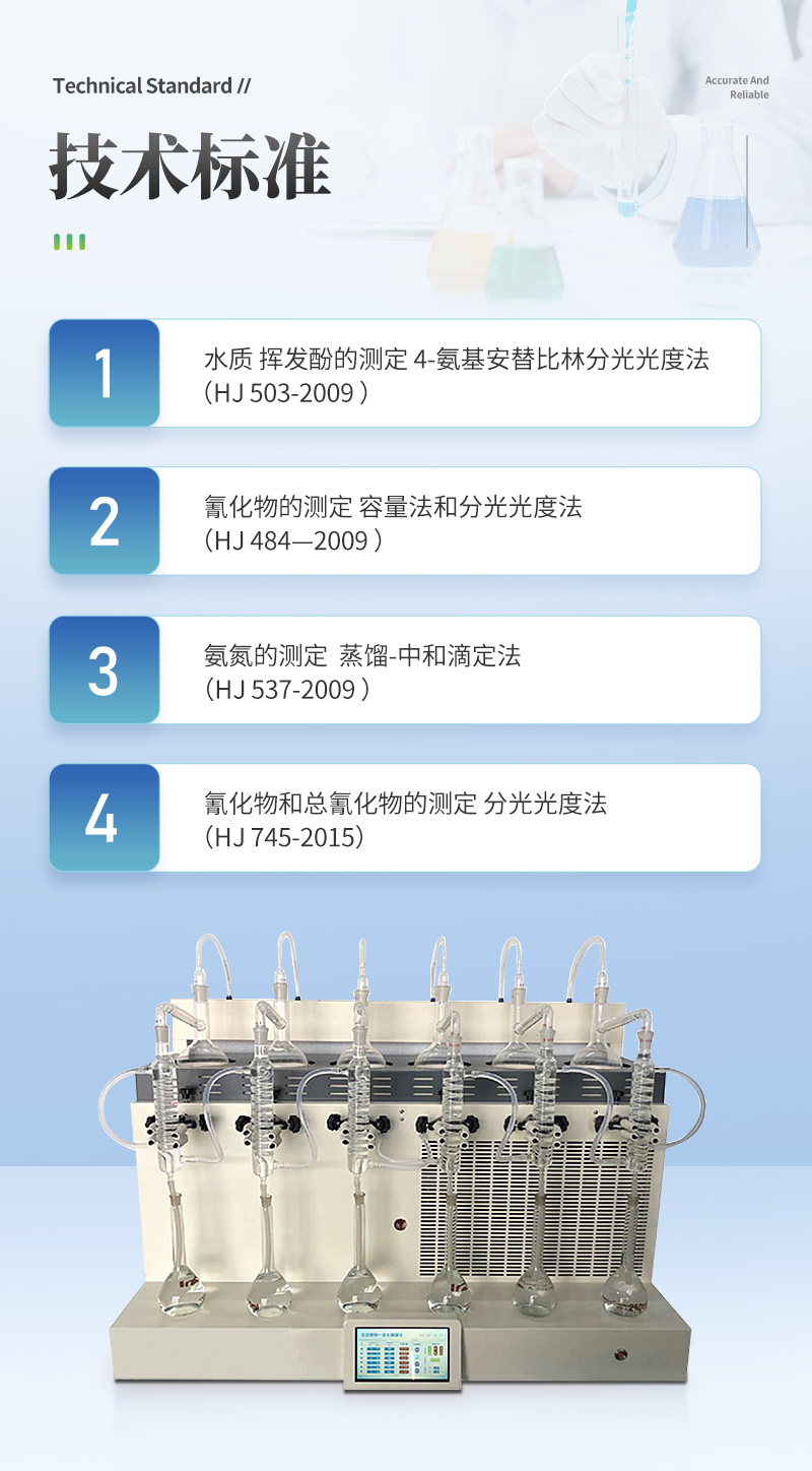 该仪器实验了控温、自动防倒吸、加热均匀、防止暴沸、智能终点控制等功能。使用方便,节能环保。经过实验室蒸馏回收率比对验证,结果准确,回收率达95%以上。该仪器可广泛适用于环保、疾控、水产、供排水、高校、科研院所、厂矿企业等各类化学实验室需要蒸馏处理的场所,如挥发酚、氨氮、凯氏氮油中水分等项目的蒸馏处理。