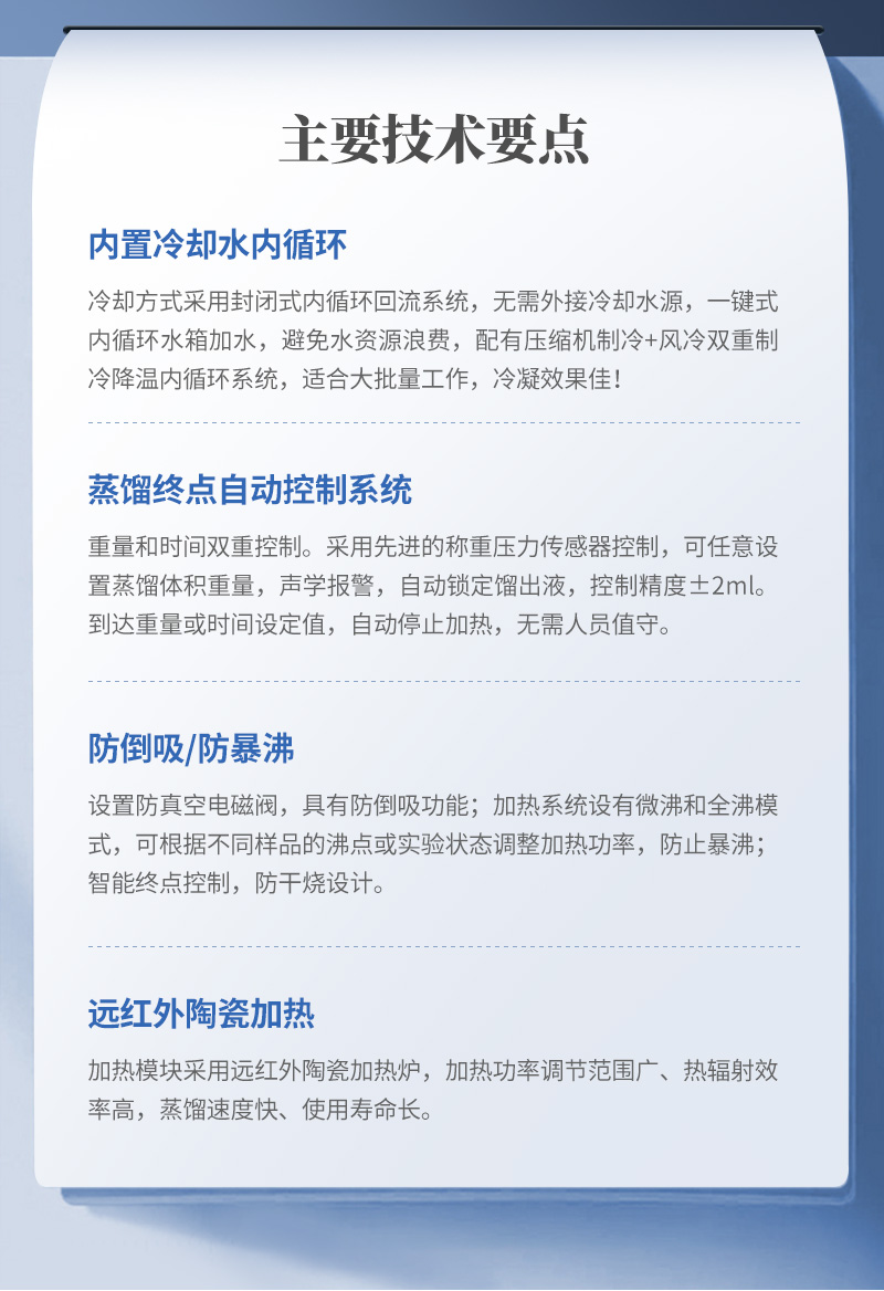 5、蒸馏终点控制:自动侦测蒸馏终点功能,采用称重和时间双重控制,蒸馏体积控制在±2ml之内,自动化程度高;